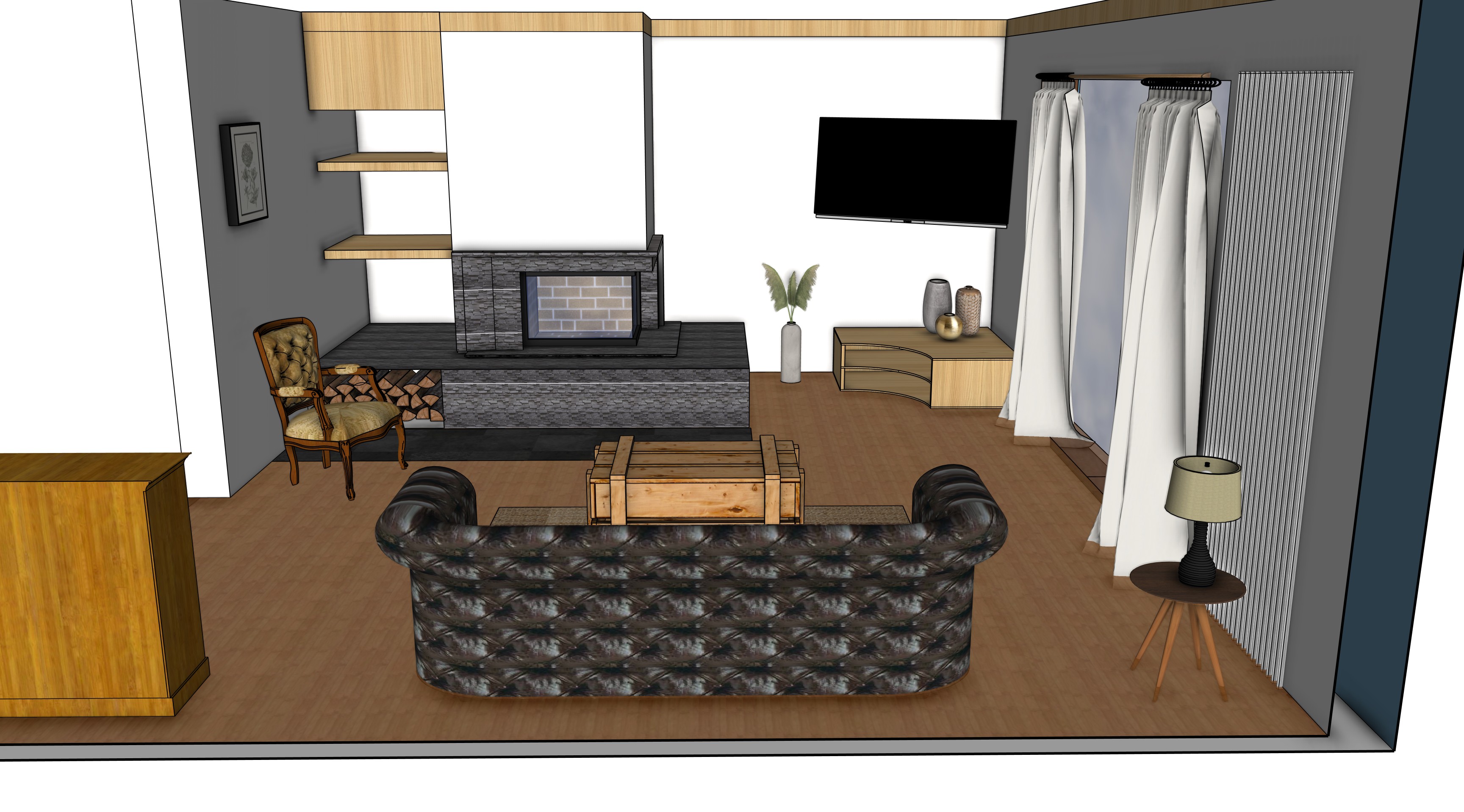 salon sol parquet murs blancs chemin e en pierres noires vitre sur le c t droite tag re sur la gauche de la chemin e en bois et ferm e au sommet petit meuble d angle en bois sous la t l tapis en juste sous la table canap en cuir marron table d appoint en bois meuble gauche du canap en bois fauteuil ancien jaune sol carrelage noir uniquement sous le bord de la chemin e sur la gauche