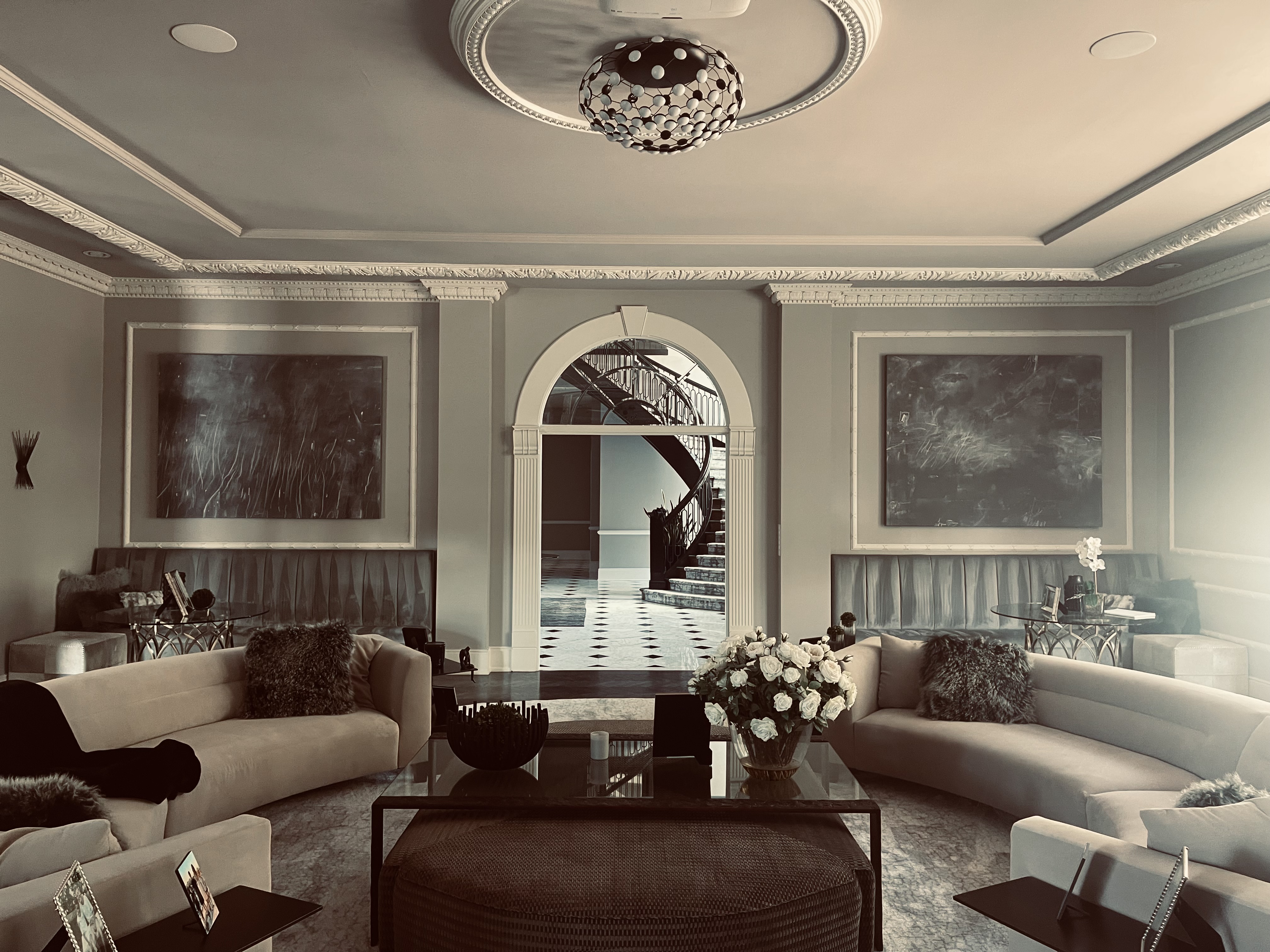 modernist interior shot remove all decorative moulding arched opening to have black trim with vertical wood slats around it left and right of opening to have u shaped banquette with texture wall behind no black on walls remove trim around door architecture