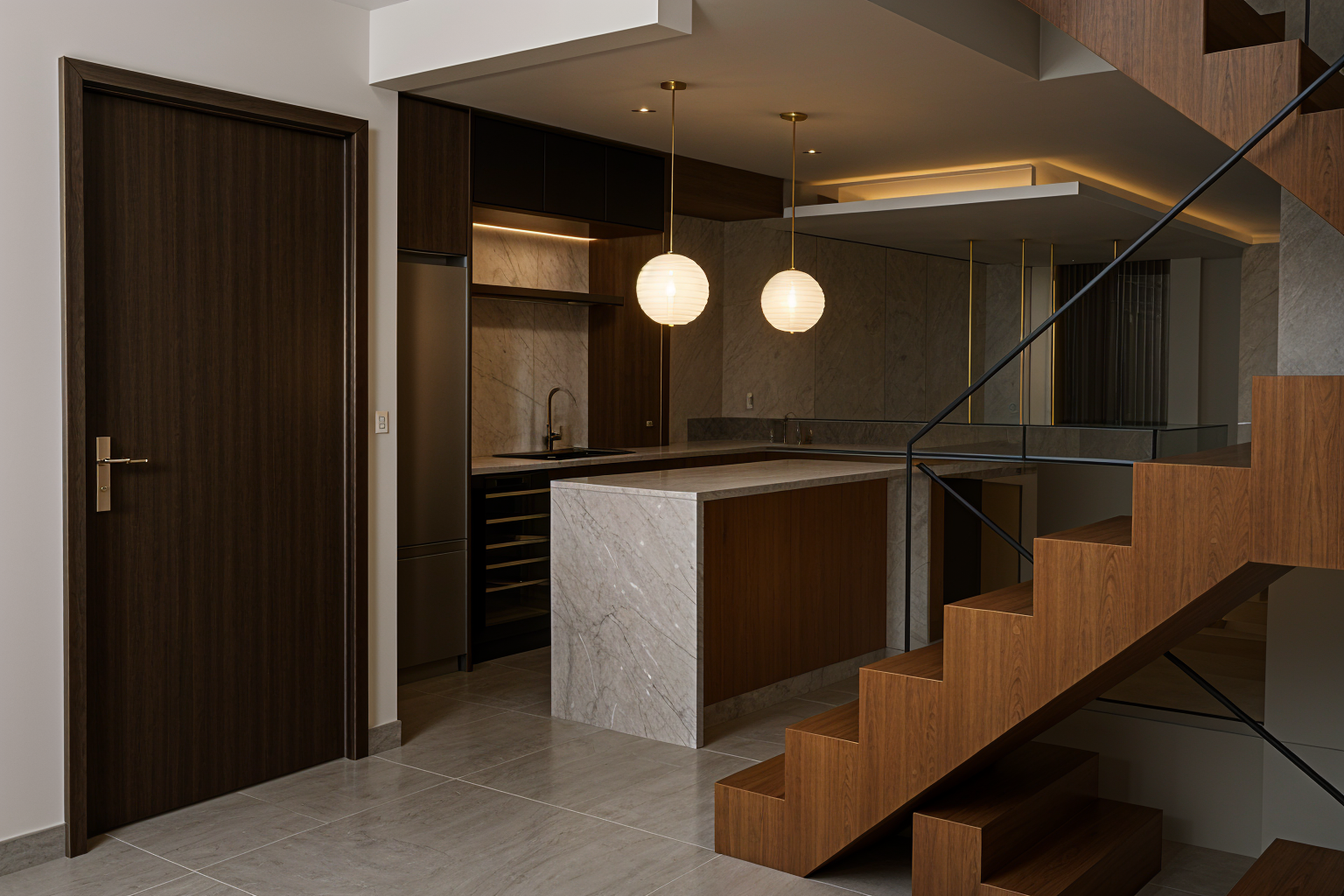 interior living room modern and minimalist design warm wood ceiling beams light neutral walls large tv on wall above a contemporary fireplace shelves with plants and vases gray sofa with textured cushions sleek black side table with potted plants blue gray cabinets in the background large windows with natural light calm and cozy atmosphere soft ambient lighting evening setting