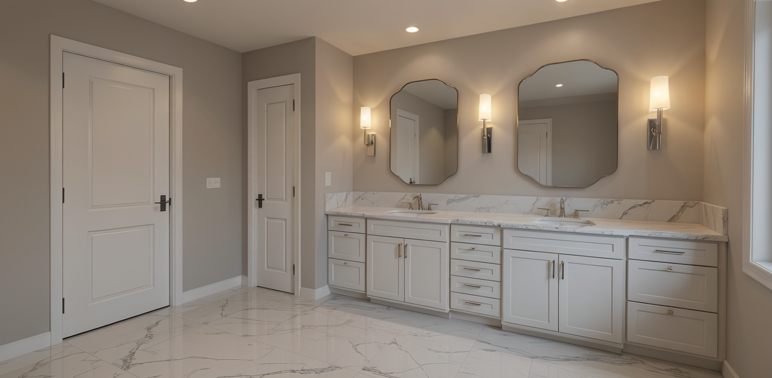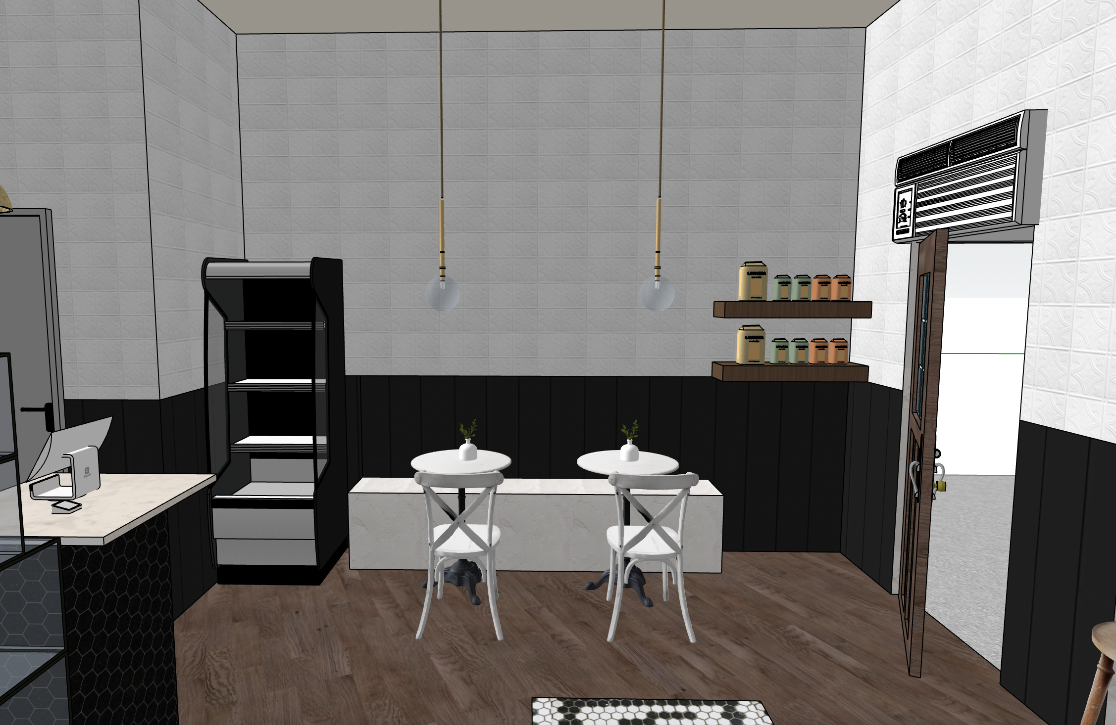 render a cozy modern caf interior with a black and white color scheme the upper walls are textured white and the lower walls are sleek black panels include two white marble tables each with a small green plant centerpiece accompanied by white chairs with a classic design the floor is warm dark hardwood incorporate a dark display fridge with metallic accents add shelves with vintage style canisters in muted greens oranges and yellows feature pendant lights with warm soft glow bulbs creating a welcoming atmosphere add a wooden door complementing the earthy tones of the floor