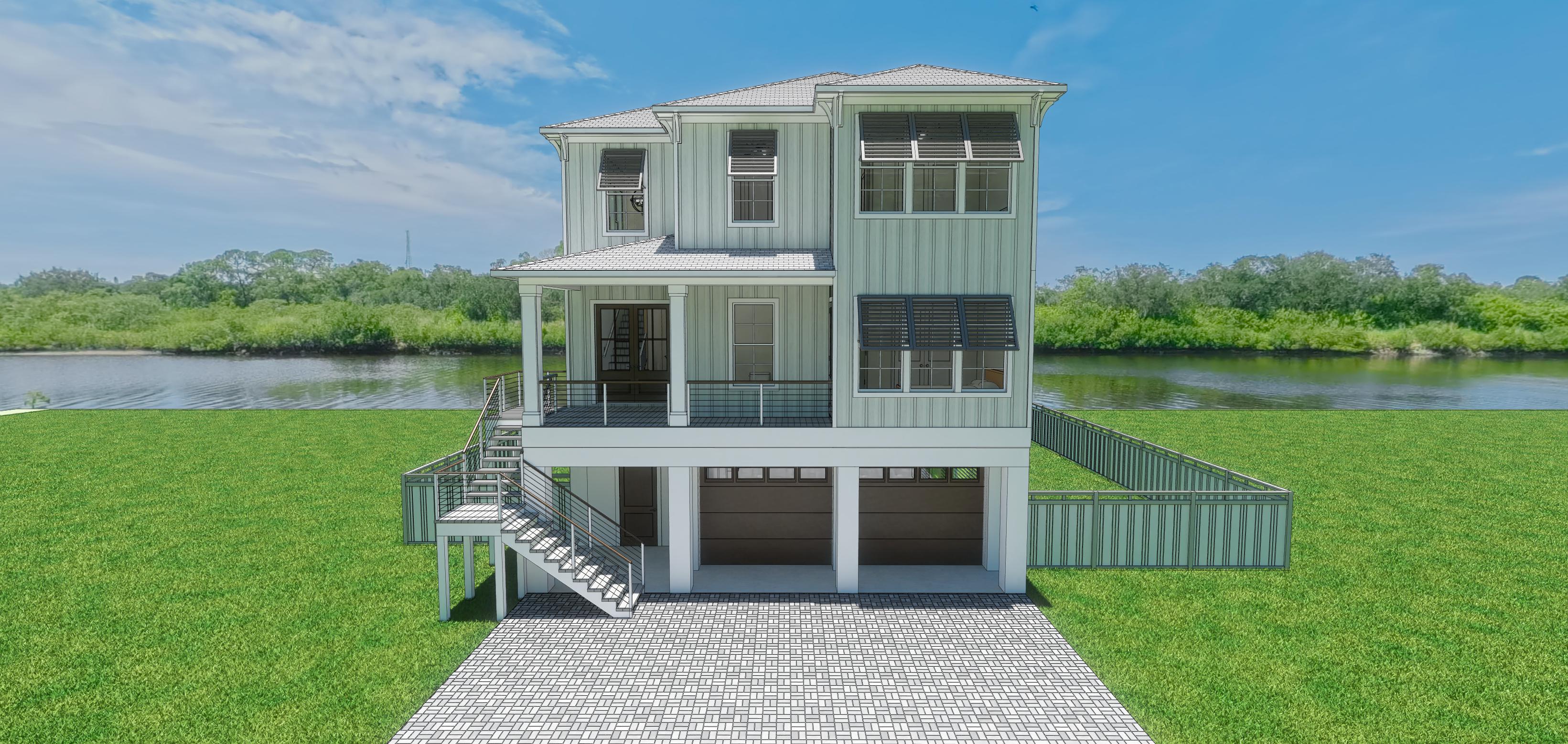coastal replace background sky with a sunny blue sky with puffy clouds add lawn and landscaping on both sides of the yard change driveway to pavers