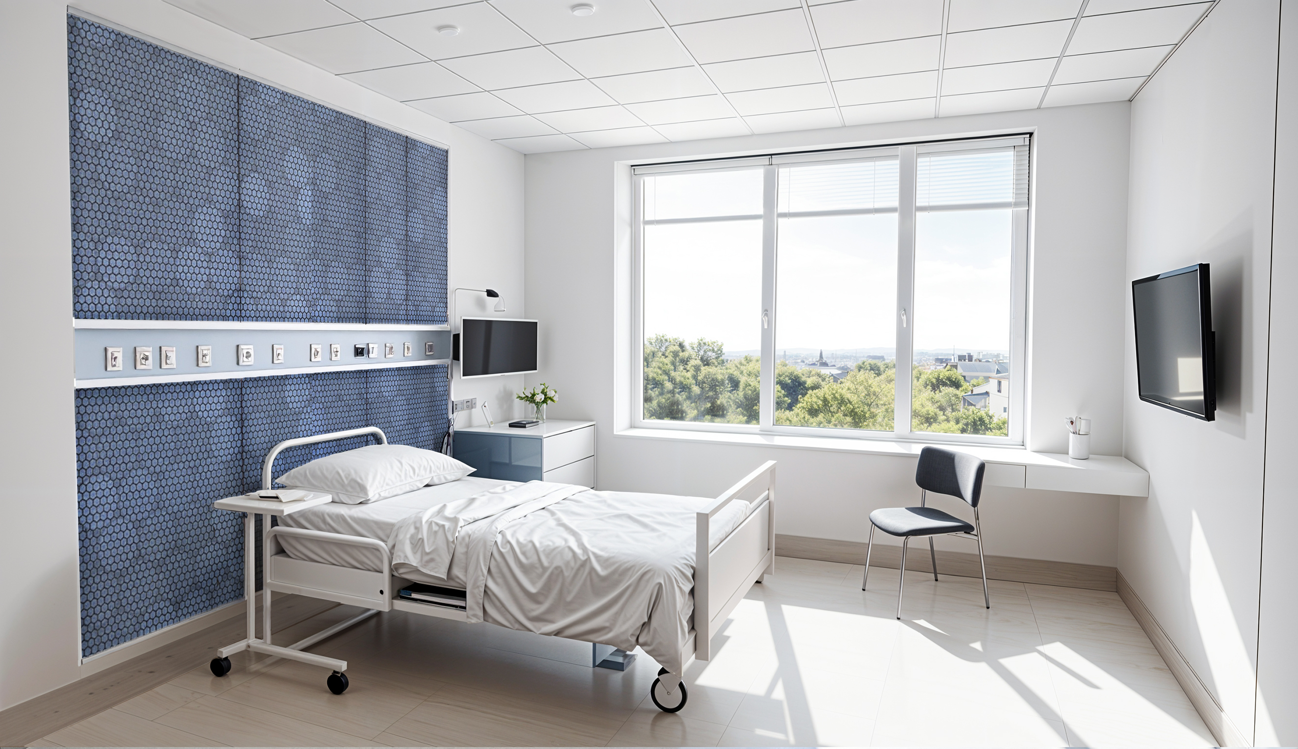 a serene cozy and modern hospital room with abundant natural sunlight streaming through a large window overlooking lush green trees and a distant cityscape the walls are calming white and the accent wall behind the bed is made of perforated metallic panels in soothing shades of green designed to discreetly conceal a clean air ventilation system the panels feature a simple and relaxing geometric pattern that adds texture and visual interest while maintaining a soft welcoming look the single hospital bed is dressed in crisp white linens and positioned beside a sleek nightstand with a small vase of fresh flowers above the bed add subtle neon lighting under the beam at the head of the bed creating a gentle ambient glow the ceiling is composed of inspectable modular panels some of which integrate square recessed lights that emit a pleasant even illumination the lighting design should feel clean bright and contemporary enhancing the sense of hygiene and freshness while still maintaining a warm inviting aesthetic the floor is pale wood adding warmth and balance to the fresh green tones of the room include a wall mounted modern television and a minimalist black chair near the window the overall atmosphere should be bright fresh relaxing and clean a peaceful sunlit hospital room with a refined modern and thoughtfully designed aesthetic