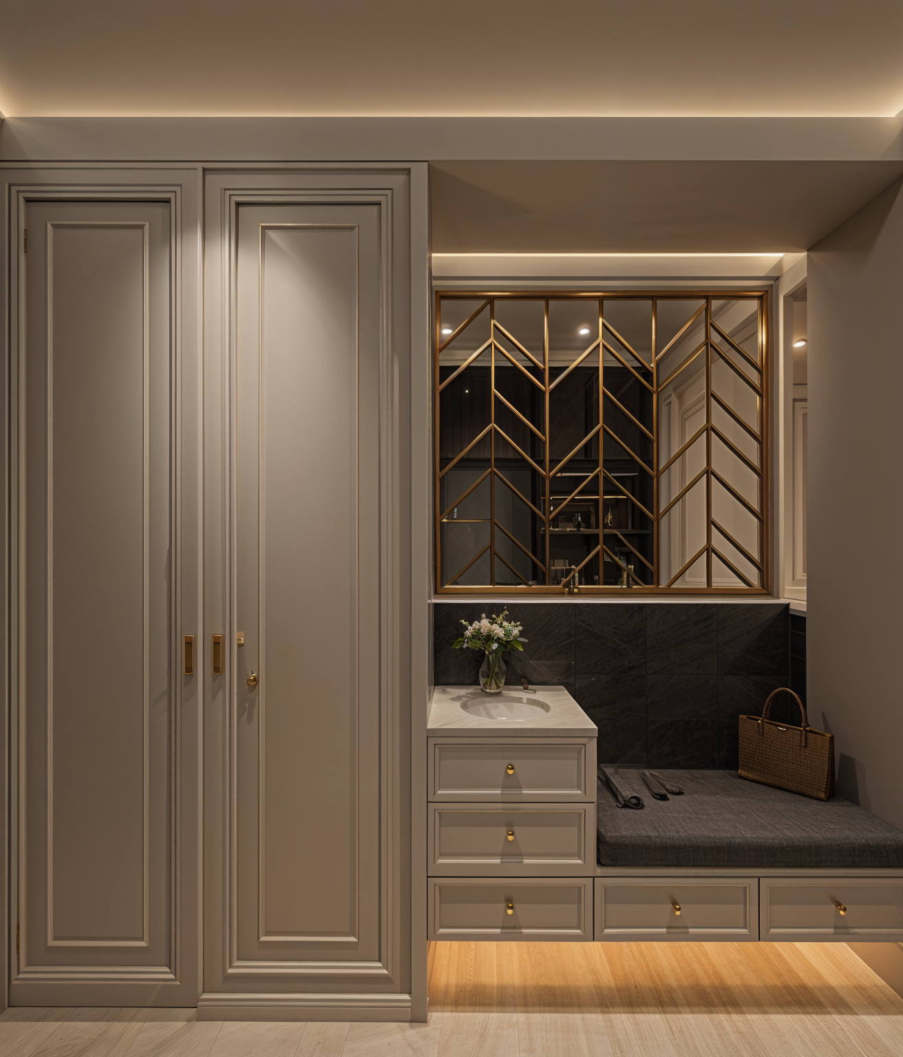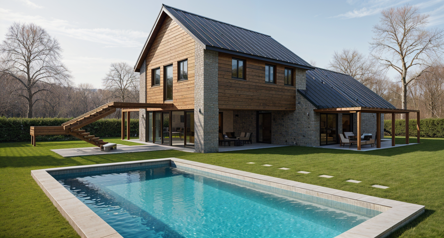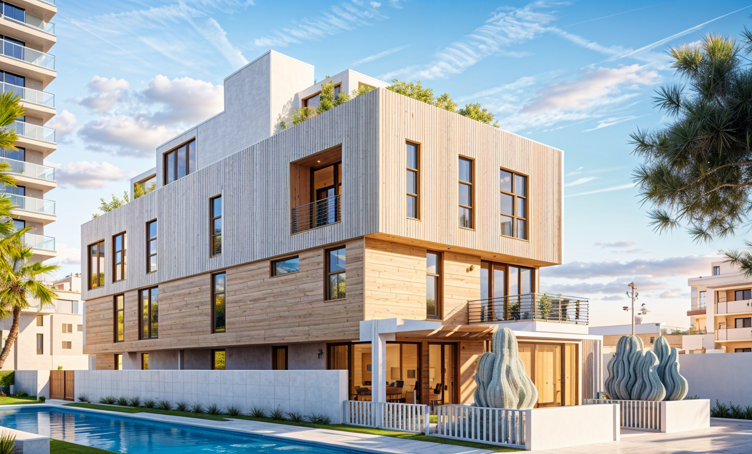render a modern minimalist house with a bright white stucco exterior accented by light gray trim the roof is a soft terracotta color large arched windows with clear glass reflect the soft warm glow of the sunset sky the scene is bathed in golden hour light creating a serene tranquil atmosphere add lush greenery around the base with vibrant green grass and a few small bushes for a natural touch under a clear blue sky walway towards the entrance stone wainscott under windows round window above entrance