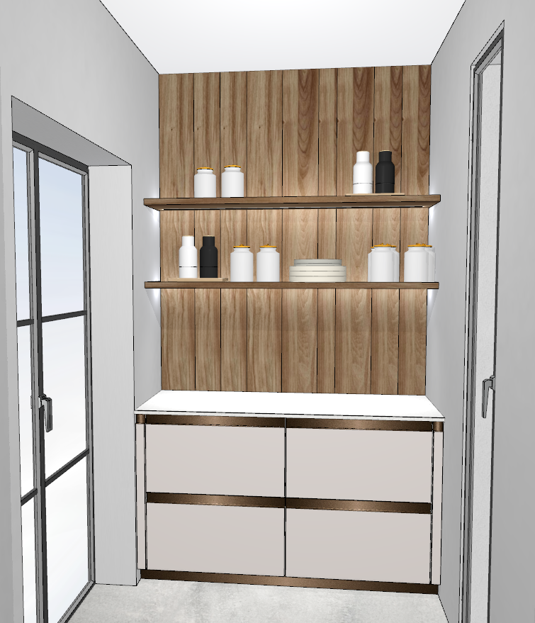 create a super realistic render of this walk in pantry unit the window on the left allows soft daylight in