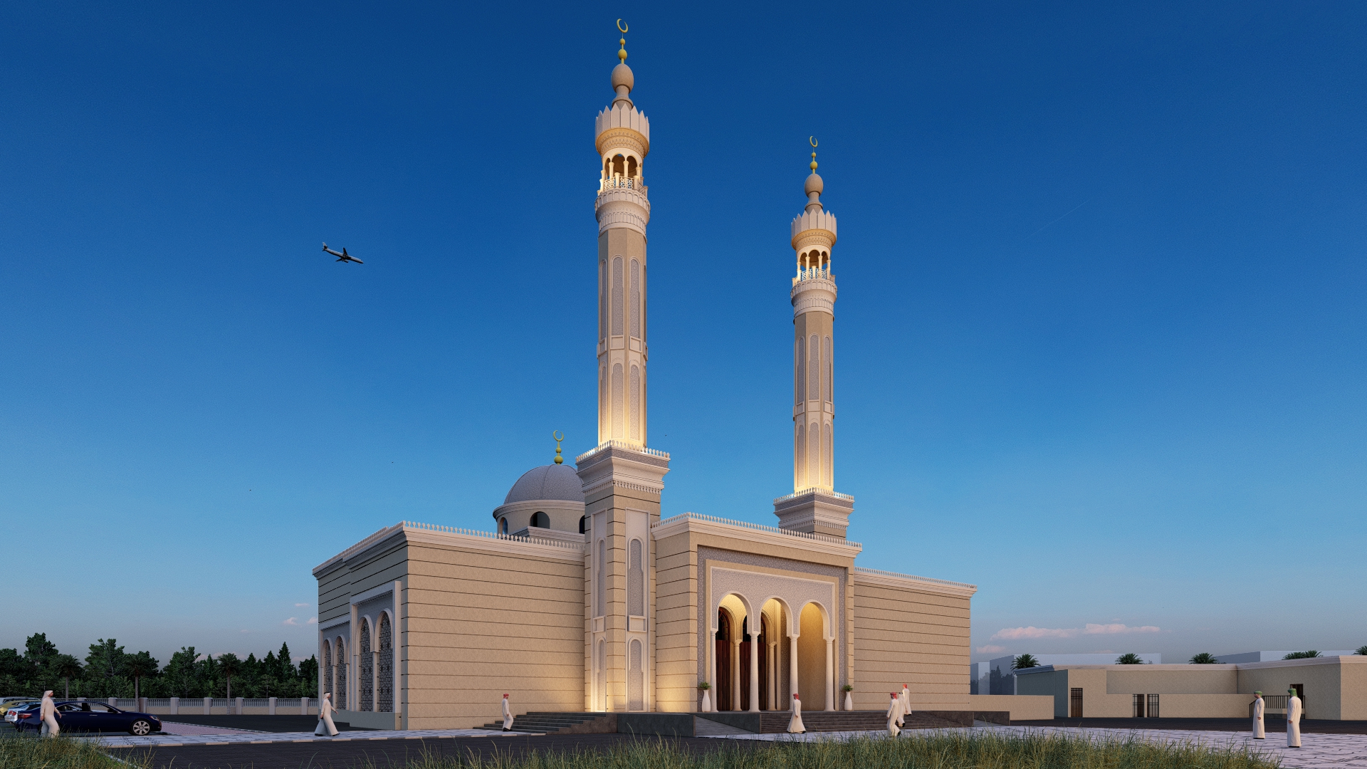 exterior shot front elevation architectural drawing of a traditional uae mosque the mosque features two symmetrical minarets a large central dome with a fish scale pattern and a golden crescent on top the building is clad in beige sandstone with red tile inlays islamic geometric motifs and intricate arabesque details the main entrance includes three pointed horseshoe arches with decorative columns and carved latticework tall arched windows contain mashrabiya style screens the mosque is set in an urban context under a clear blue sky with soft shadows minimal landscaping and a clean paved street in front