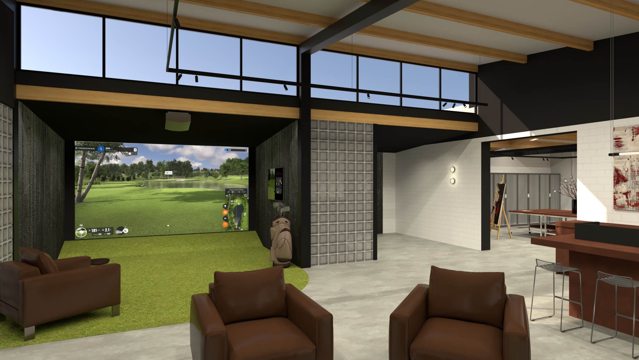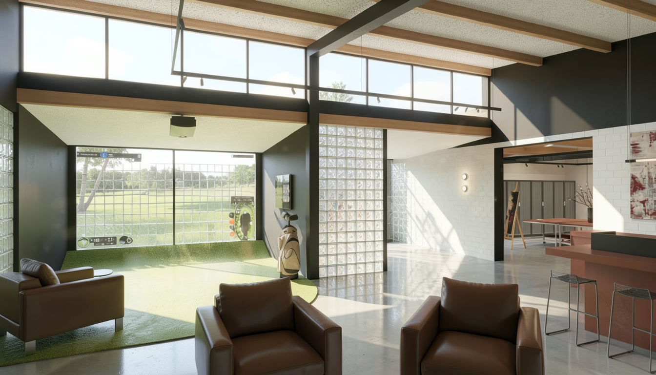 i want a realistic image of this render nothing may be changed about the content of the image only make it look realistic the floor is lightly polished concrete glass blocks have been used a small wall at the top there are windows where natural daylight can come through the white part of the ceiling should have a cellulose spray ceiling texture the texture of the spray ceiling may be very coarse in the niche on the left there is a virtual golf game the back wall in this area is therefore an image of a golf course that is projected via a projector
