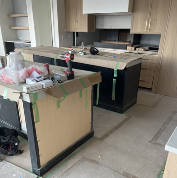 do not change the cabinets at all preserve the exact cabinet colors materials finishes door style drawer style hardware proportions reveals geometry and alignment exactly as shown do not alter the countertop flooring walls ceiling angles perspective lighting direction appliances or any architectural elements keep the camera viewpoint absolutely identical only remove clutter construction materials and unfinished areas clean the room and make it look fully finished add only minimal tasteful staging items appropriate for the space do not add or change anything about the cabinets countertop or room structure negative constraints no cabinet changes no perspective changes no angle changes no color changes no resizing no shape changes no geometry changes no filler changes no hardware changes no new cabinetry no wall changes no added shadows that distort structure add new flooring countertops turn the lights on stage for a kitchen add a range top below the hood add do not change anything else about the cabinet layout at all keep the perspective of the image as is