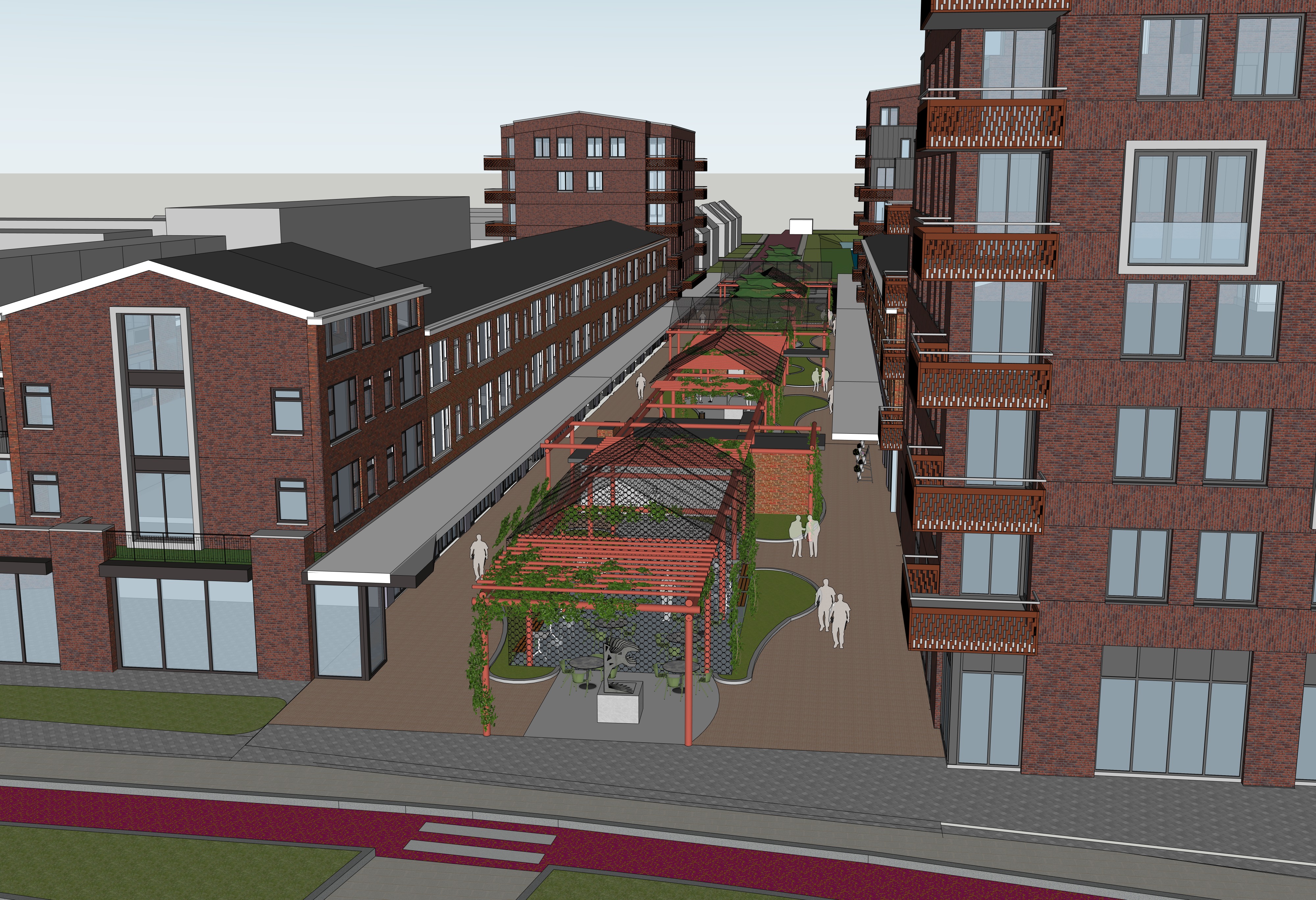 make a photorealistic rendering of this public space add a lot of shopping people and some flowers plants and bushes