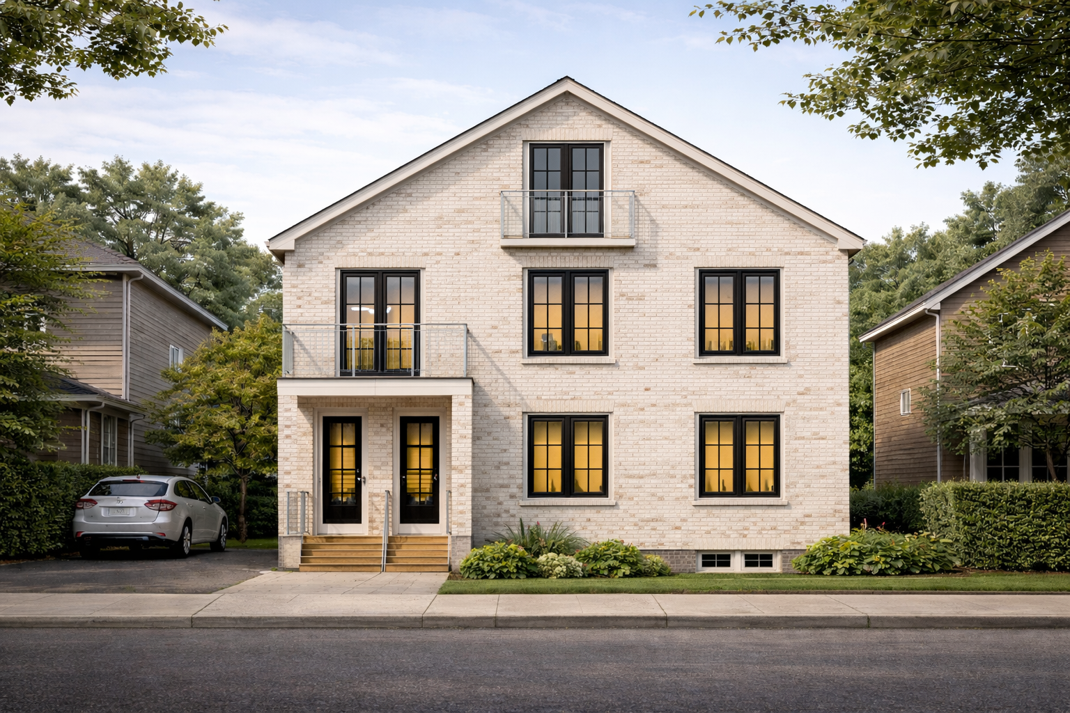 make a photo realistic rendering off white brick and solid doors glass railings too