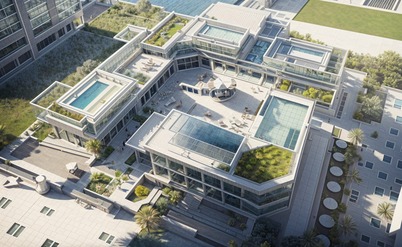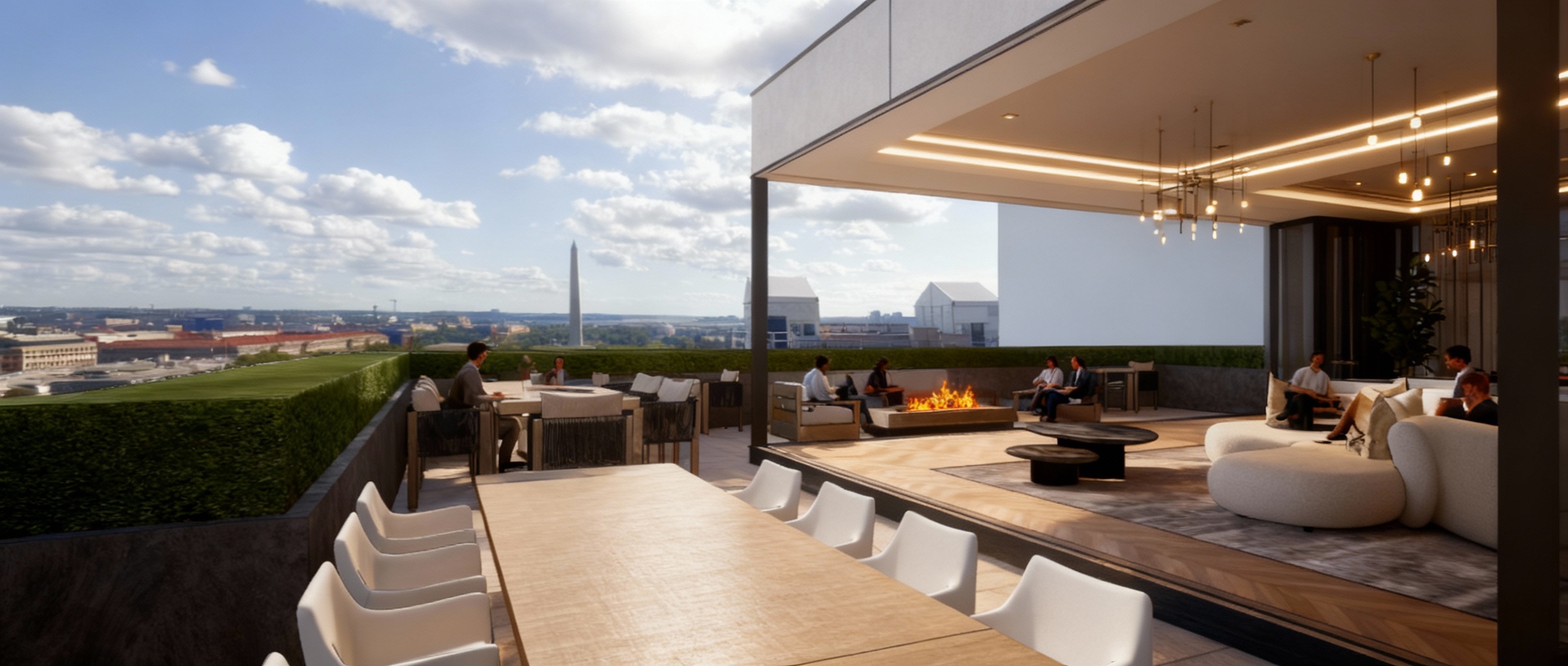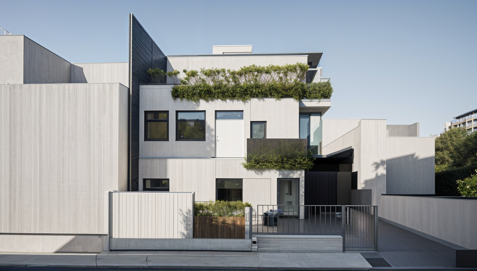 light gray stone for the base and main corner extending all the way up white composite panels with black accents trim canopies bands window frames shutters for the rest solid black garage doors a lively ambiance with people walking and warm interior lighting from within