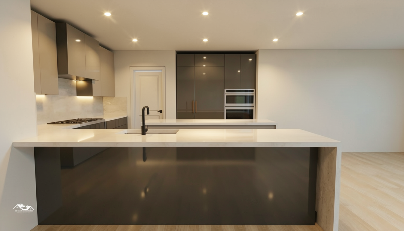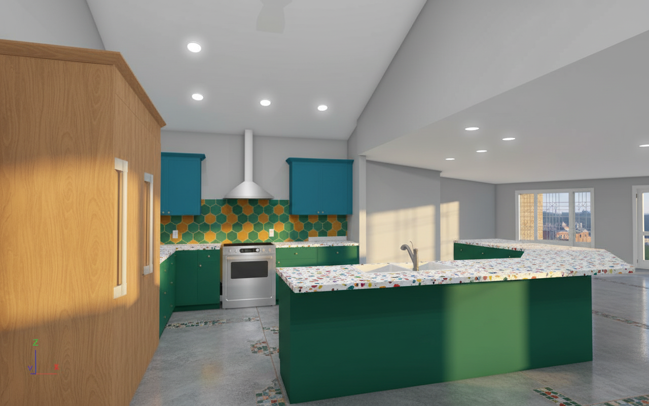 postmodern interior shot adjust the finishes of this kitchen without chaning the location of the range hood or cabinetry do not change any architectural elements do not change the floor change the cabinet finishes countertop colors materials as if you were an interior designer architecture