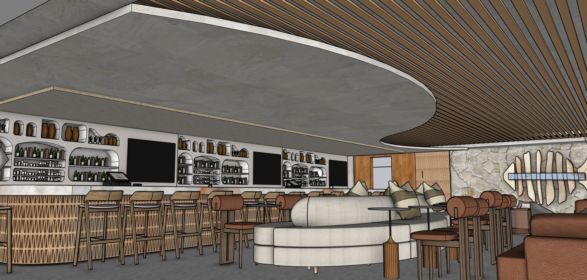 add led light 3000k inside bar noches make bar top retro lite cristalo stoe 3000k add lef strio gap veilinh all warm lighting thouyr make a louge amniance aff ligt on gap circle ceiling att light coming from right of image make it overal 3200 k light wartmth lige bat sounter top as a retri light cristalo stone ober led panel