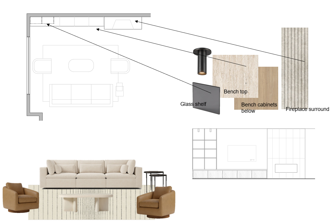 great living room layout rendering using floor plan and elevation on concept vchips on concept are materials of fireplace wall built in and use funiture as in concept