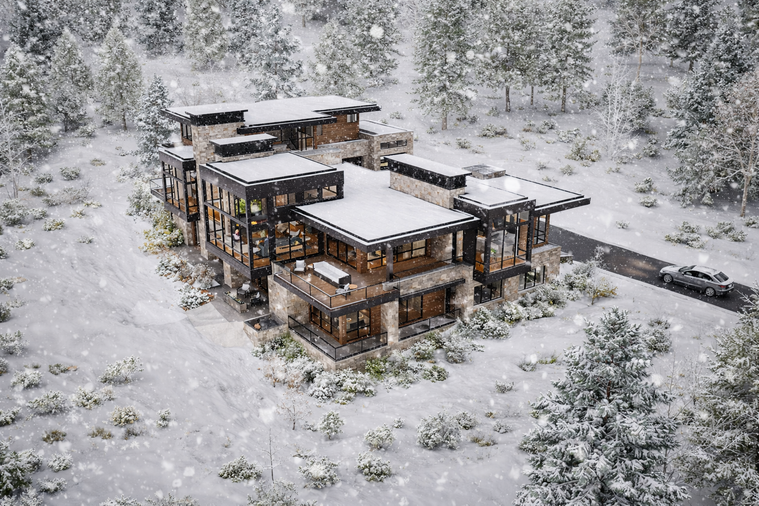 don t change the structure enhance the landscaping around the exterior to be more dense and realistic make the snow on the terrain feel more realistic add light illuminating from the windows on the inside add snow falling in the foreground of the image lastly make the materials more natural and feel more realistic the stone to be a creamy light tan black metal panels and a warm brown wood material