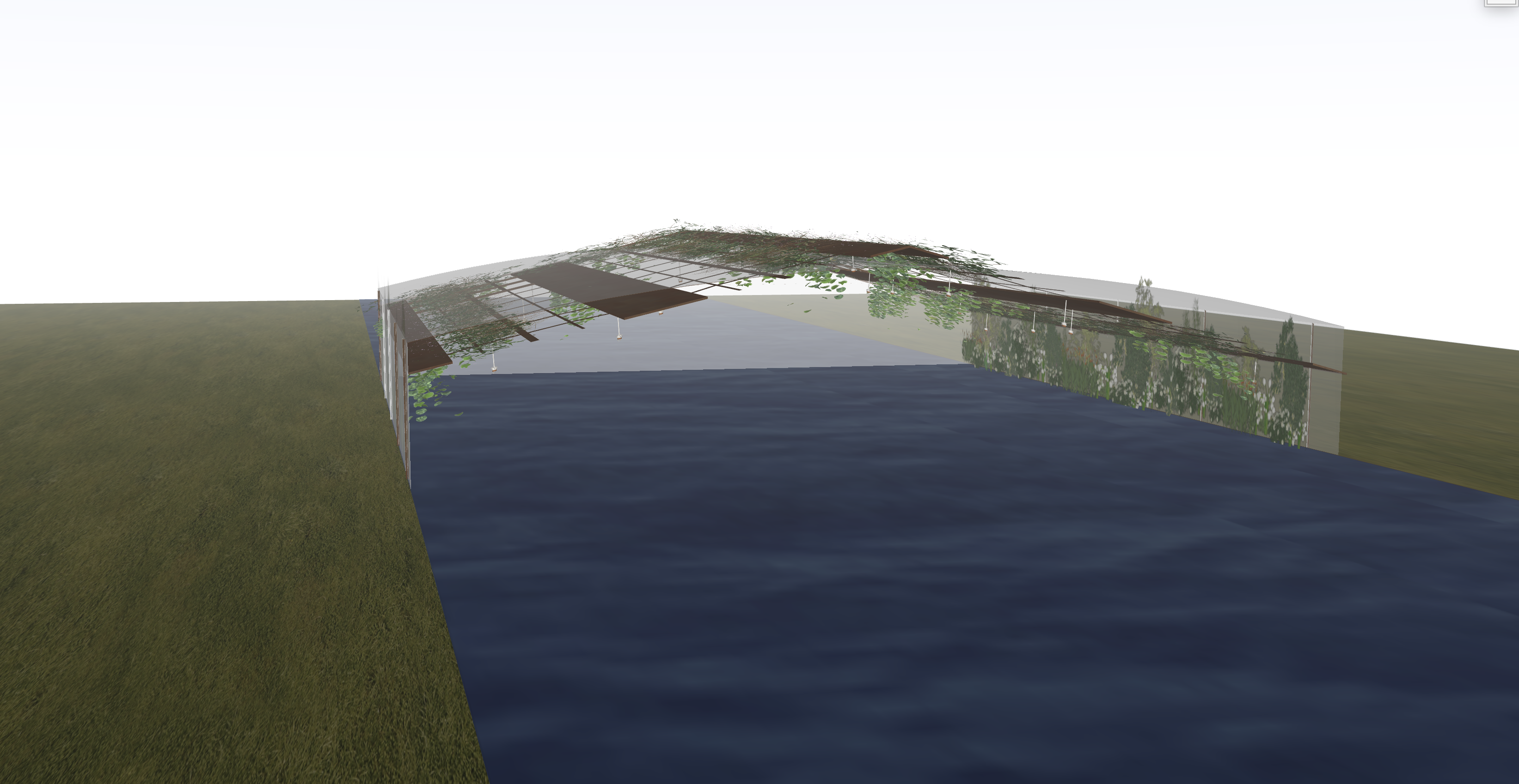 its a green house on top of water and standing on grass it has a lot of plants inside its a sunny day its made of glass and corteen steel for its structure it has a shape rounded in its roof architecture
