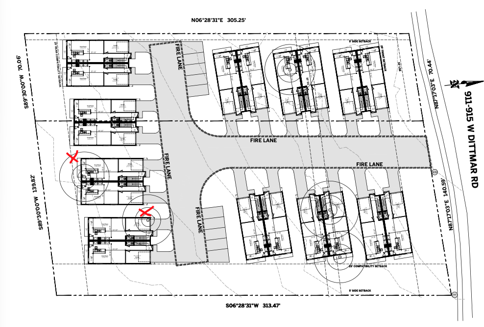 transform this site plan into a clean simplified visual diagram remove unnecessary technical text notes and clutter while preserving the layout of buildings driveways and parking enhance line clarity and spacing to make the plan easy to understand at a glance use subtle shading or color to differentiate buildings drive lanes and open space keep proportions accurate but improve readability and visual balance final result should look like a clean developer presentation graphic not a technical drawing