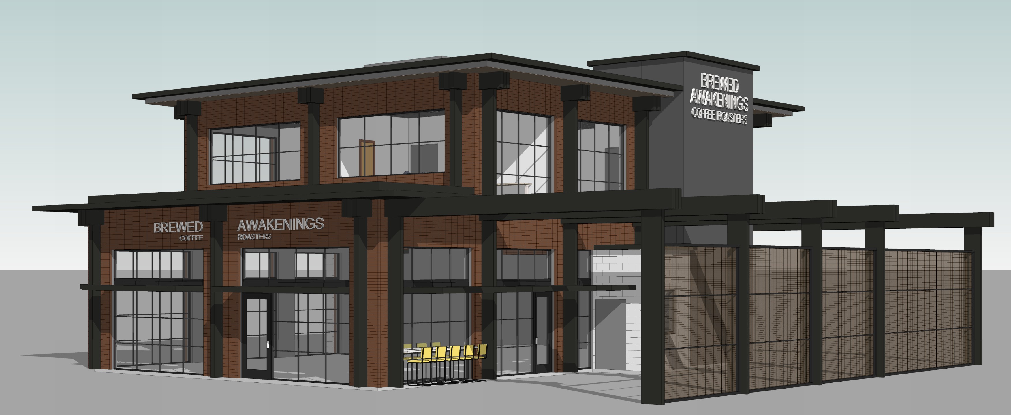 two story building with a coffee shop on the ground floor and offices above there is a drive through for cars between the building and the screen wall early morning in vancouver washington