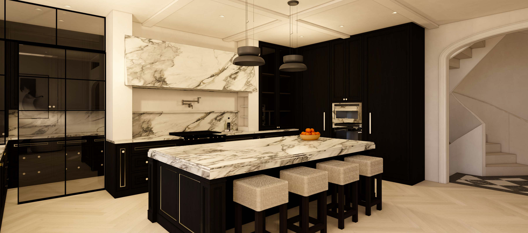 keep the existing kitchen architecture layout windows and ceiling exactly the same redesign the materials and detailing to create a more layered architectural kitchen with stronger texture and craftsmanship turn the island into the sculptural focal point by adding fluted tambour or reeded wood paneling and a thicker marble countertop edge approximately 4 5 inches use darker warm wood cabinetry and introduce aged brass accents for contrast strengthen the pantry transition with a framed or sliding reeded glass door so it feels like an architectural moment emphasize material layering by combining wood texture dramatic marble veining and metal details the kitchen should feel warm dimensional and high end european in style textured and architectural rather than minimal or uniform