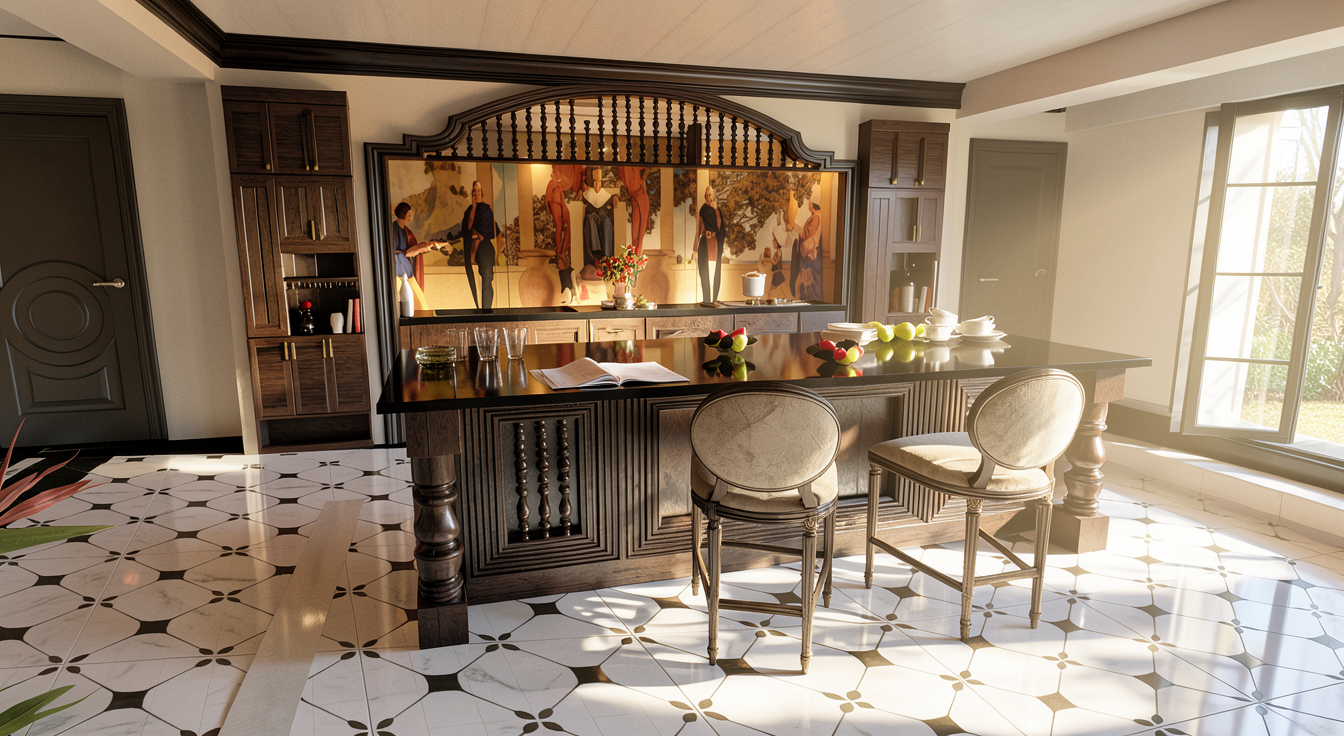 transform into a high end hyper realistic visualisation keep the view the same same walls same window add luxury lighting below bench add lighting inside marble alcove keep materials the same just enhance them and add detailed textures and reflections