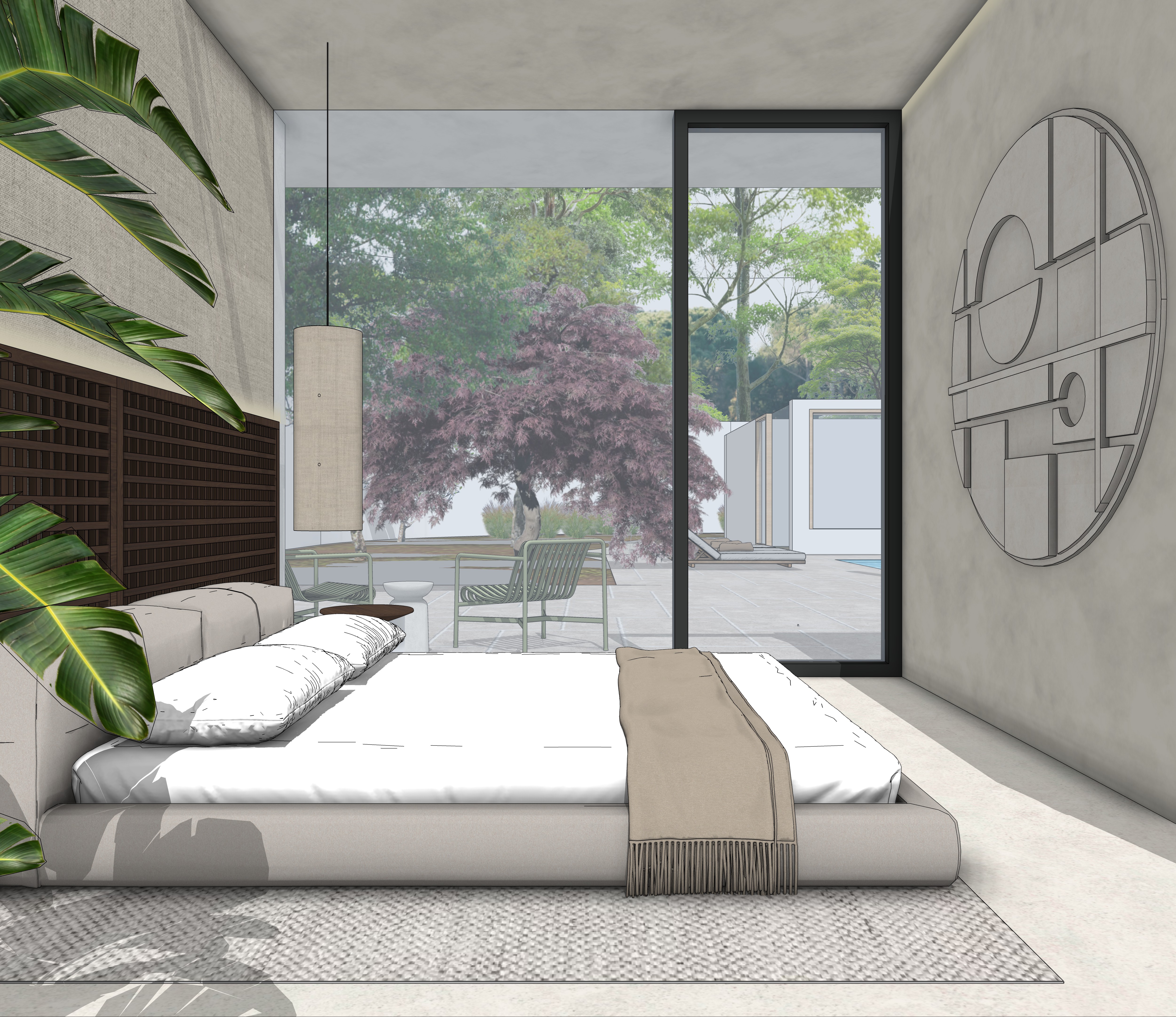 daylight microcement dark walnut wood off white square wooden panel behind the bed