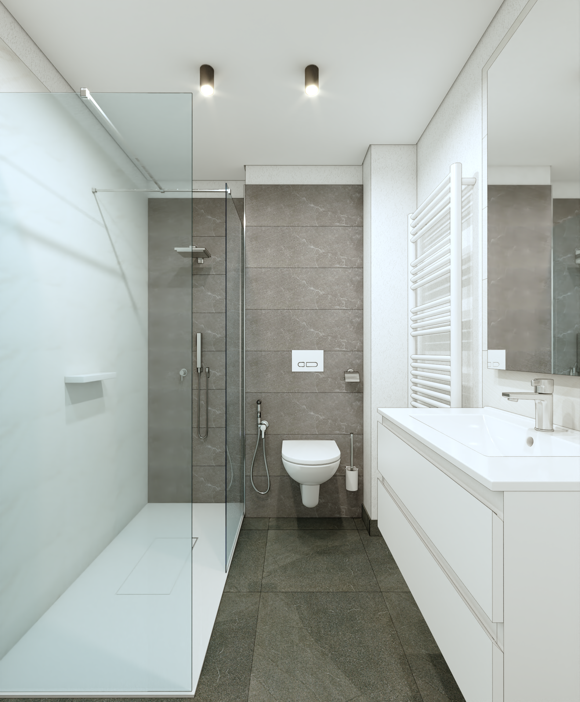 contemporary interior shot modern bathroom interior with a minimalist design featuring a transparent glass shower enclosure the shower walls are a soft white marble with subtle gray veining adjacent is a sleek floating toilet against a smooth taupe wall with faint marble patterns the floor is covered with large dark slate gray tiles giving a grounded feel on the right a long white vanity with clean lines complements a large mirror above gentle white lighting creates a serene spa like atmosphere architecture