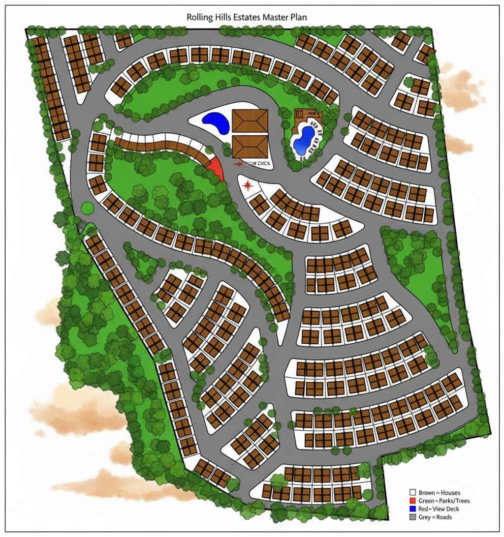 a housing development with rolling hills site red indicates view deck brown houses put in trees and cars iclude electric post to make it realistic