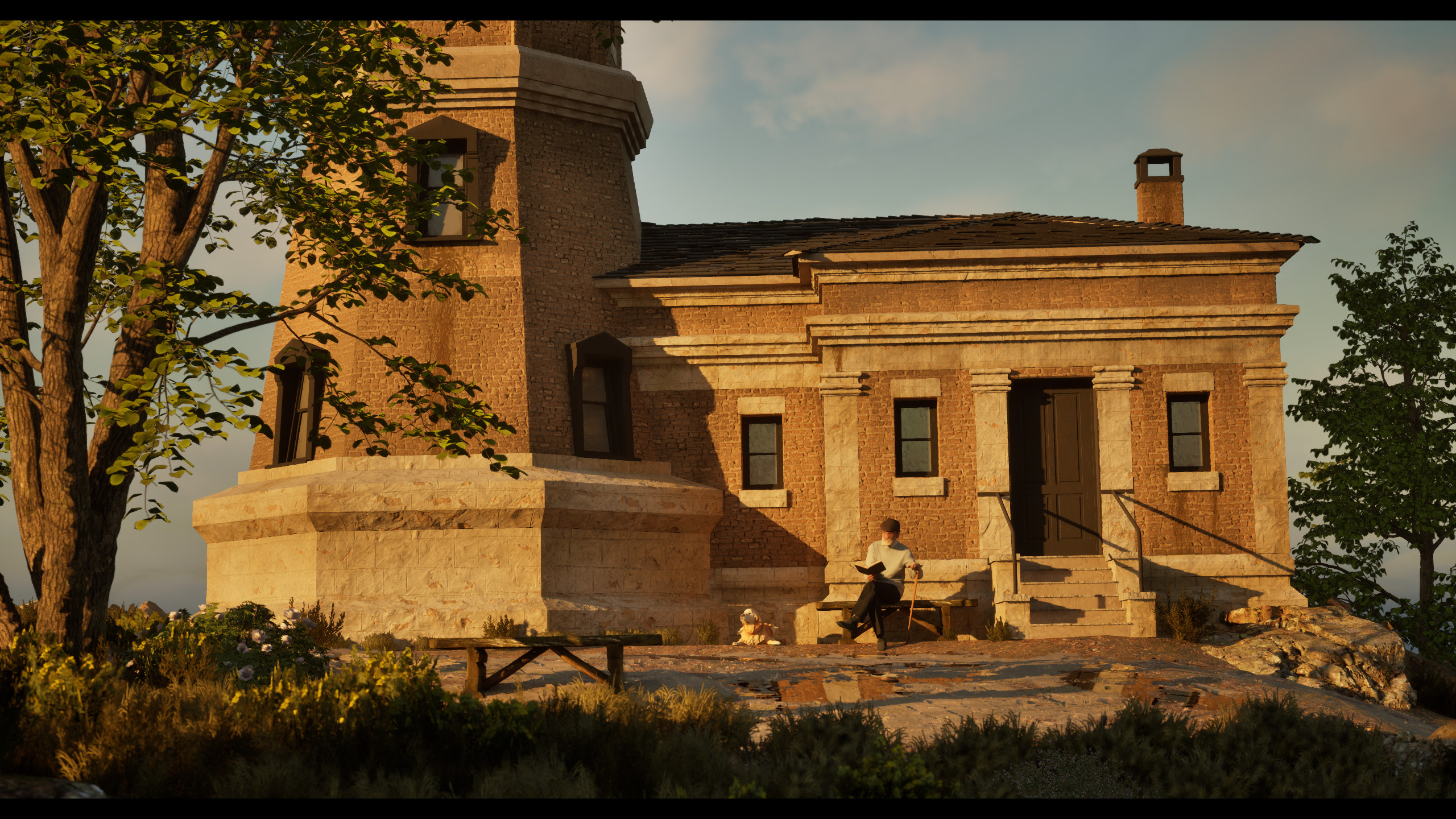 hyperrealistic render of an old light house walls made of bricks roof made of black stone the architecture is sourronded by north america vegetation the old light house keeper is readind a book with his dog sitting next to him romantic goldenhour lighting depicts a touching image sharp details 4k resolution
