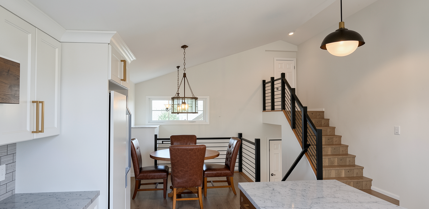 finish off this addition dark grey lap siding with board batten accents stained cedar columns with faux beam carrying the upper floor big windows