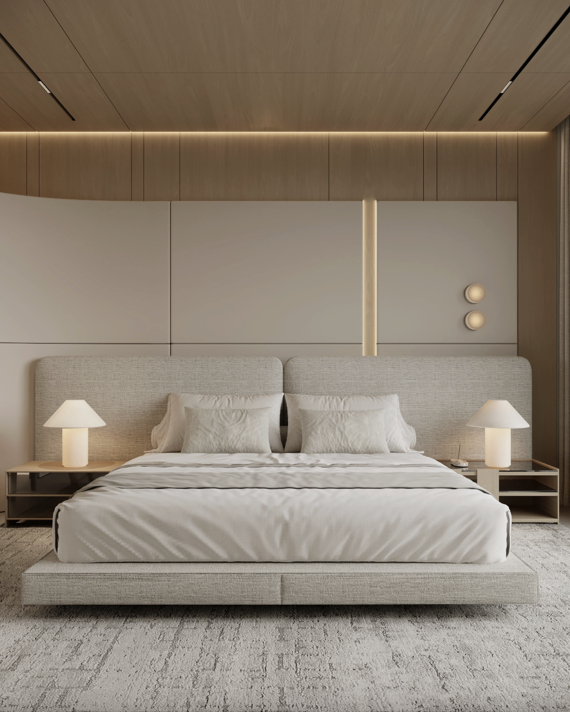 change the headboard from the input image to the model from reference image the headboard features horizontal cylindrical cushions fabric appears to be or high quality textile