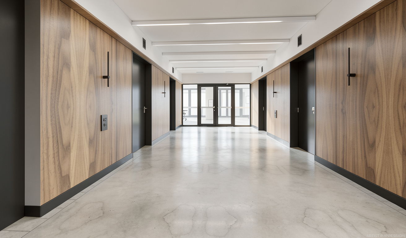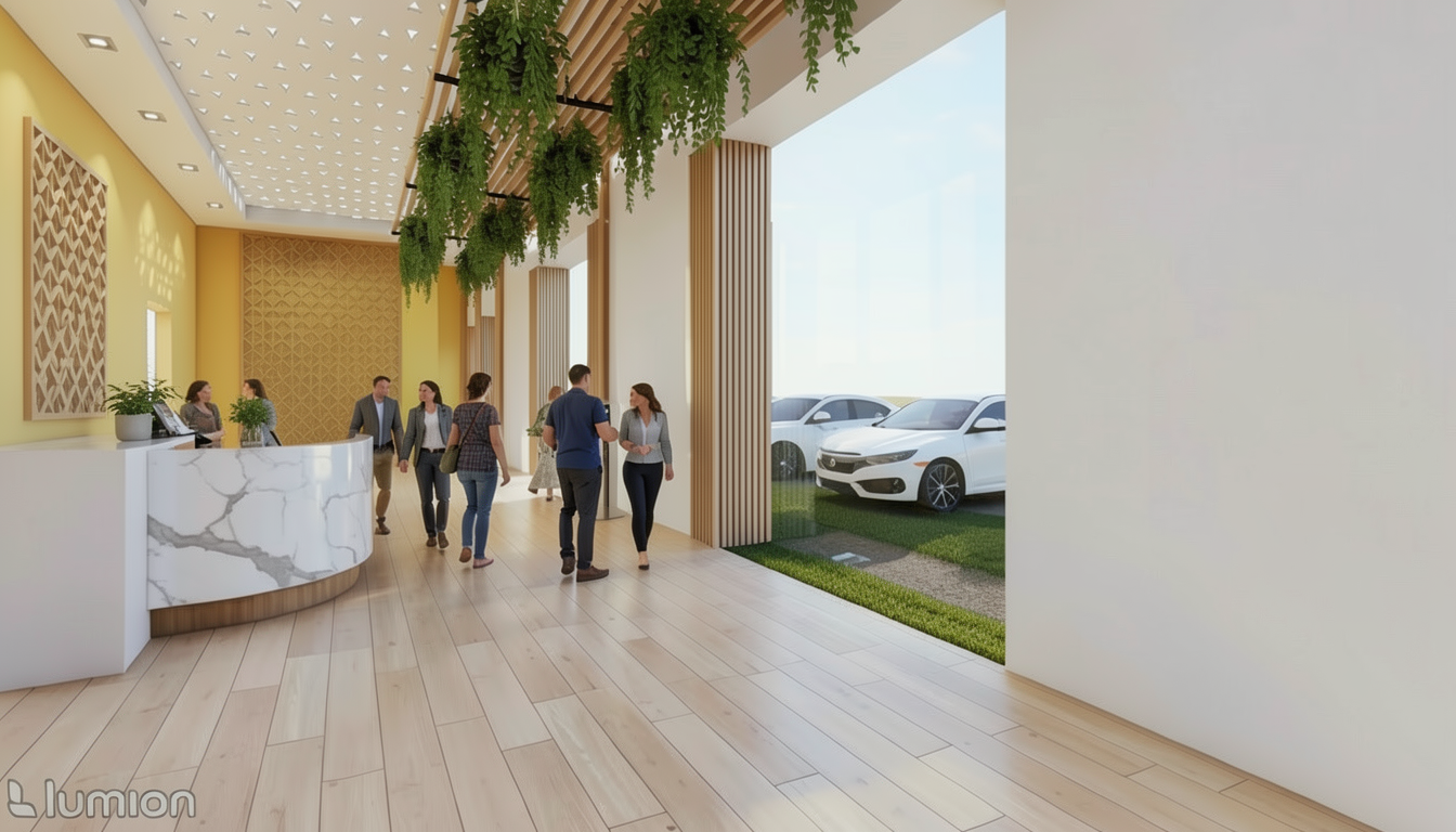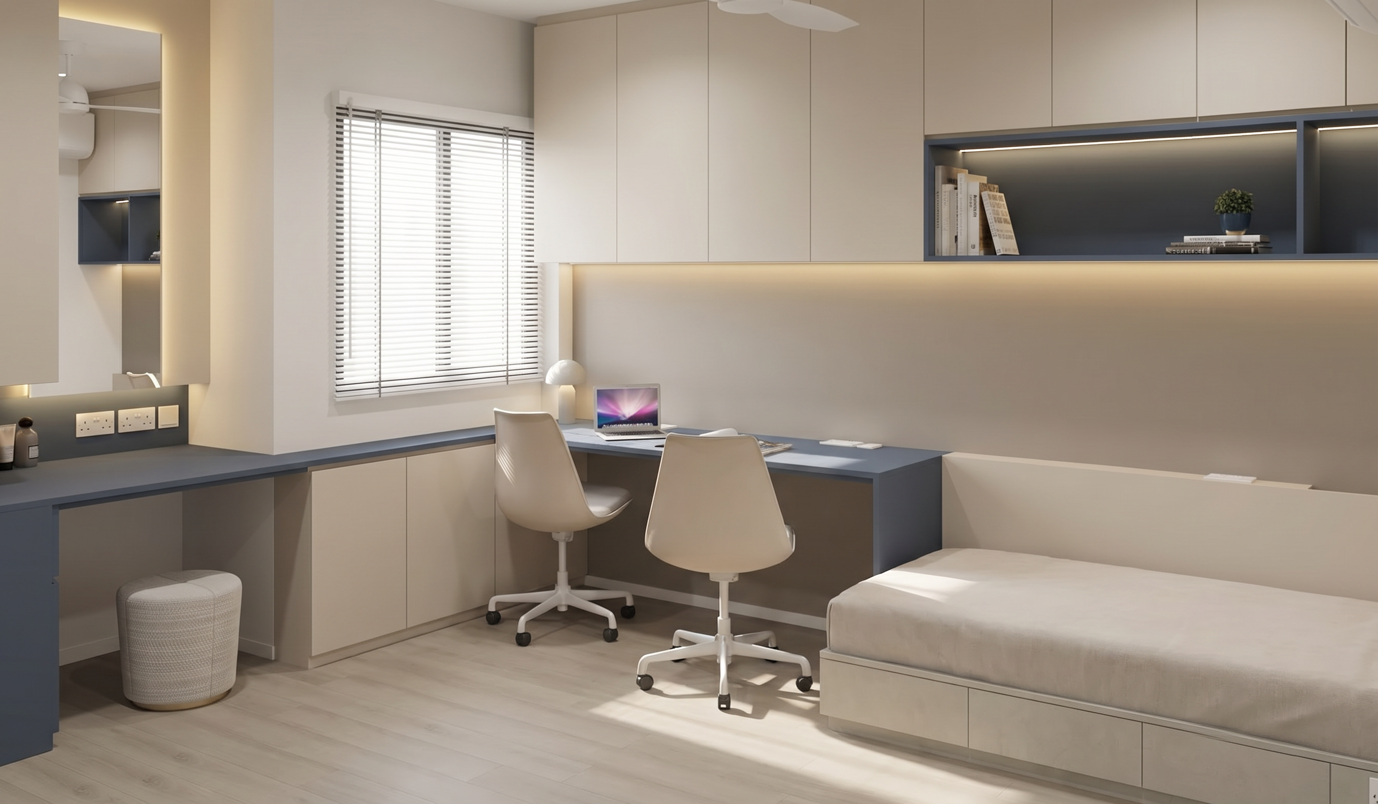colours to remain accurate as per original given picture wood texture to be subtle niche internal table surface and finger groove in mid darker blue laminate moderately saturated with a grey undertone colour should appear deeper and richer but still muted not overly vibrant matte laminate texture vu finish with subtle surface grain non glossy top hung cabinet in solid colour light beige 2 casement door below window in solid colour light beige bed base in light beige microcement bed headboard in solid colour light beige ceiling in off white floor in muted light beige vinyl subtle grains ceiling fan in white 1 wall in medium neutral beige paint with a slight grey undertone muted and balanced colour should appear soft and earthy rather than yellow with a natural sand like tone smooth matte wall paint finish other walls in off white blinds in white wall skirting in off white