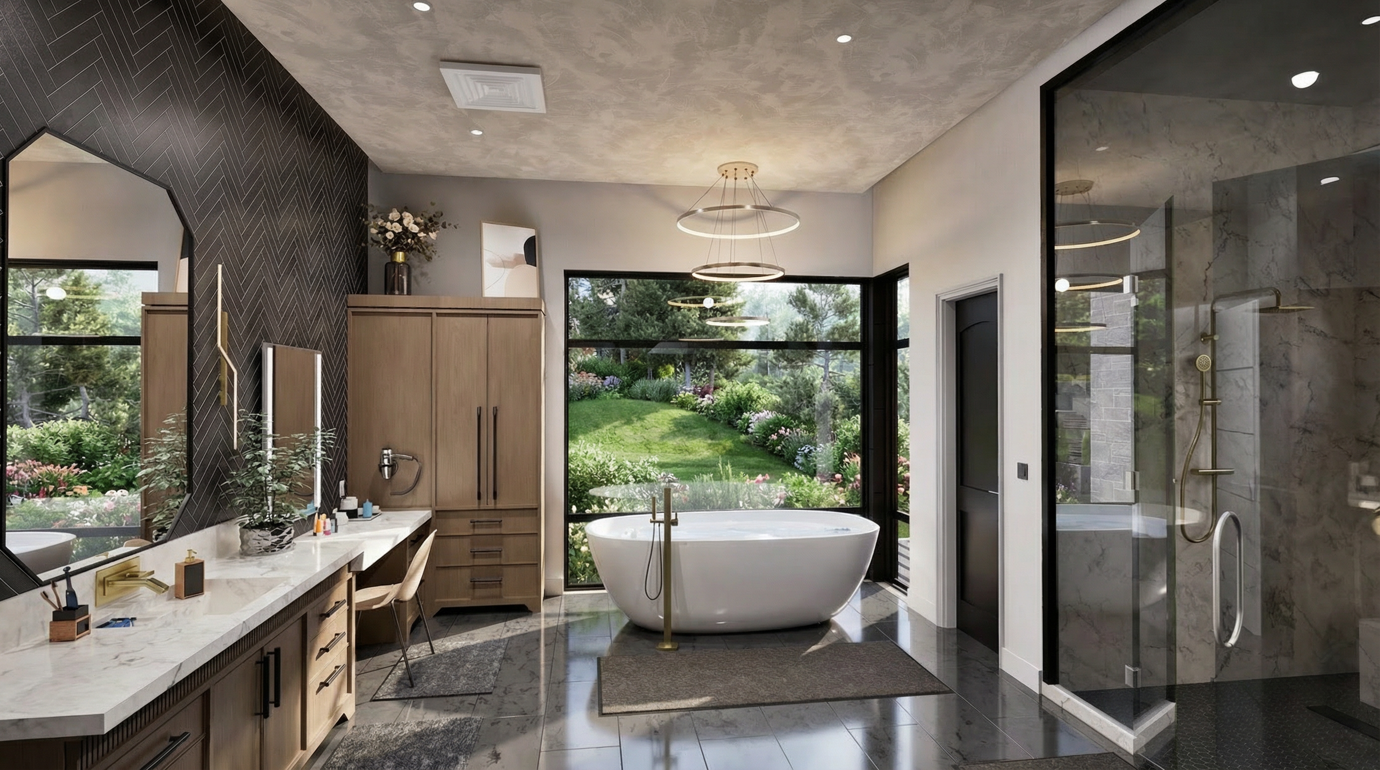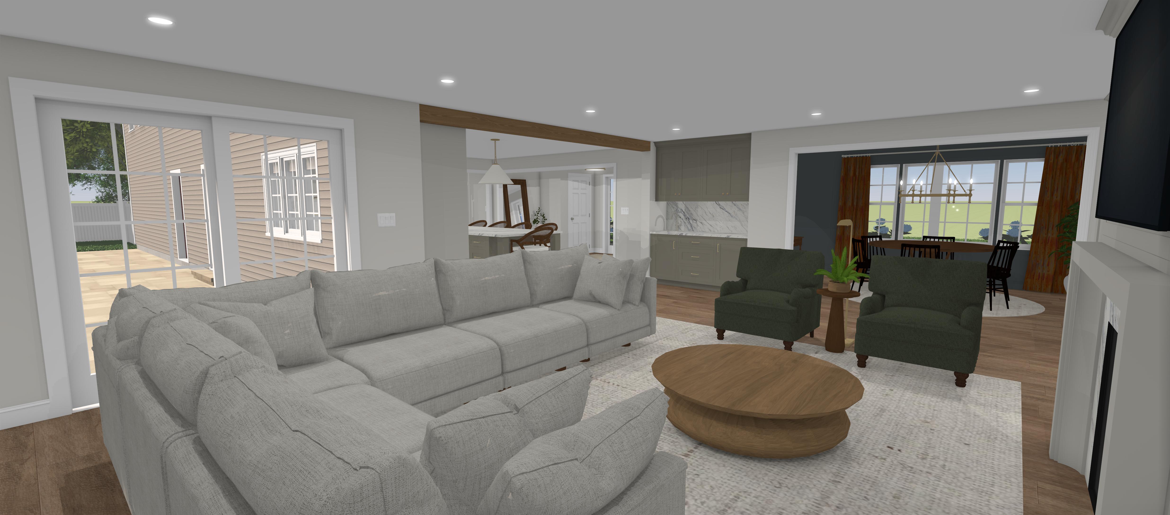 create a realistic rendering with dramatic natural light through the window with the ceiling lights on very low