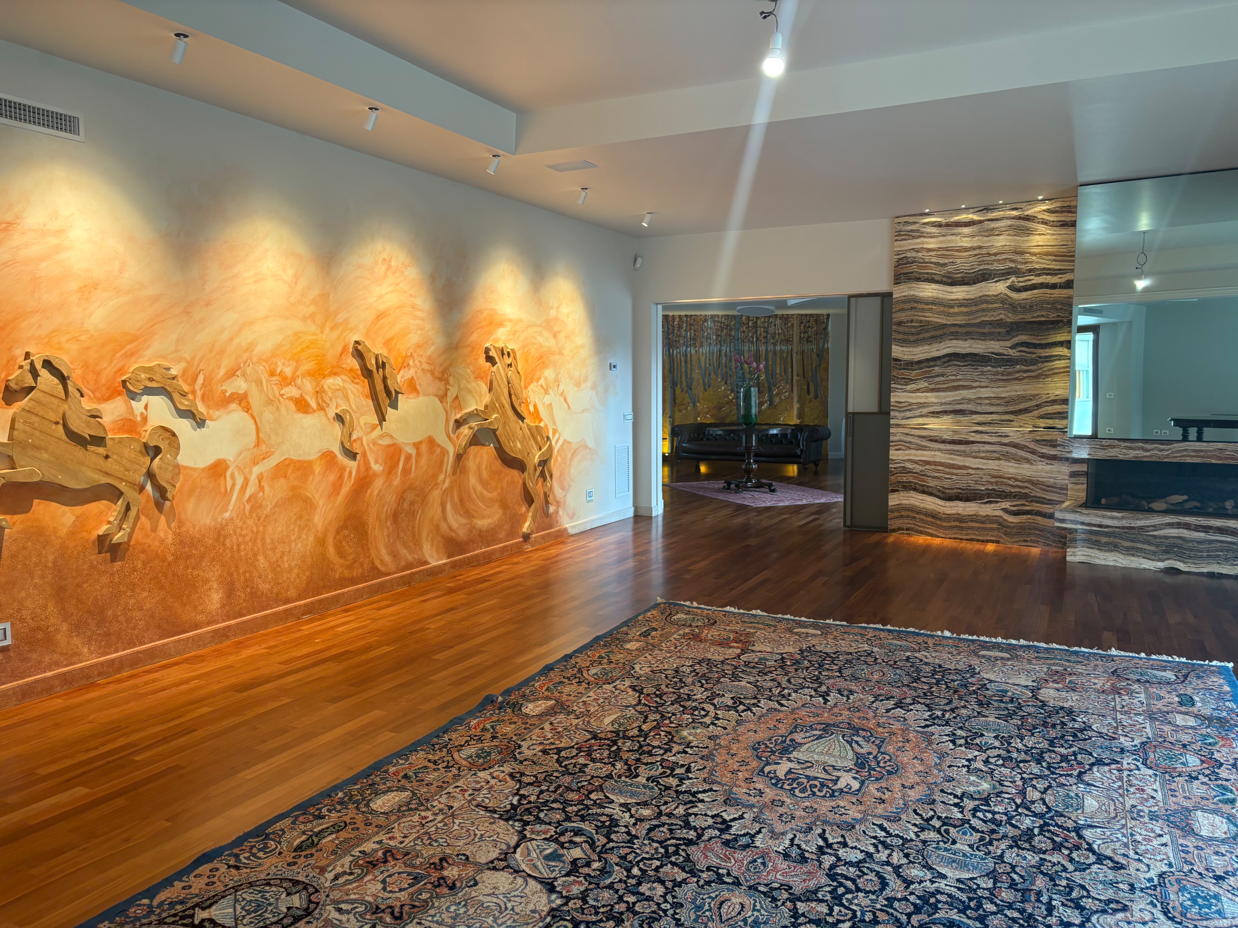 aggiungi divano ad angolo che copre i due lati del tappeto color terra di siena con cuscini a contrasto neutri e tappeto neutro e una chats longue lc4