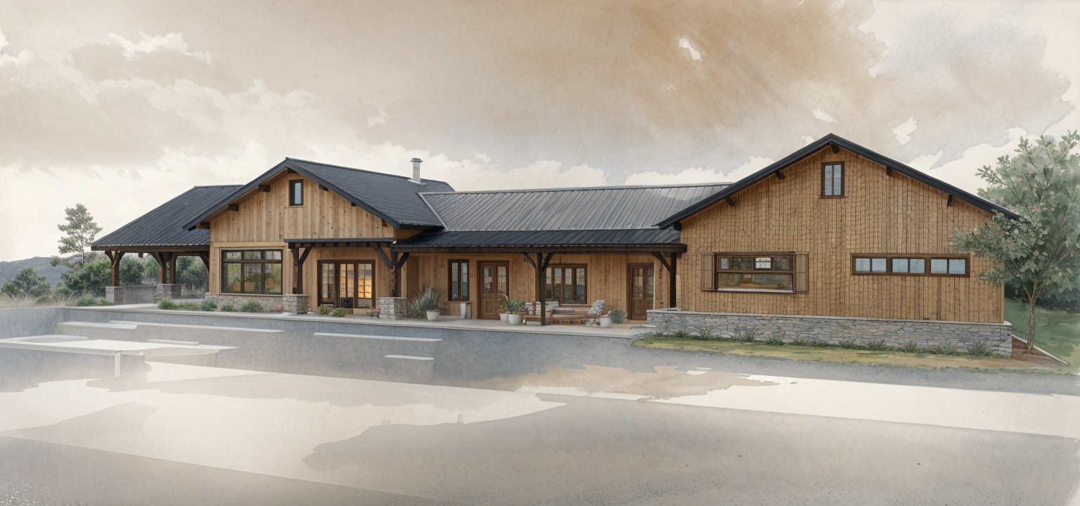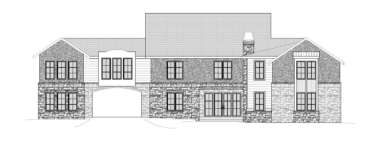 make this drawing a sketch with the materials add light landscaping and driveway going through porte cochere
