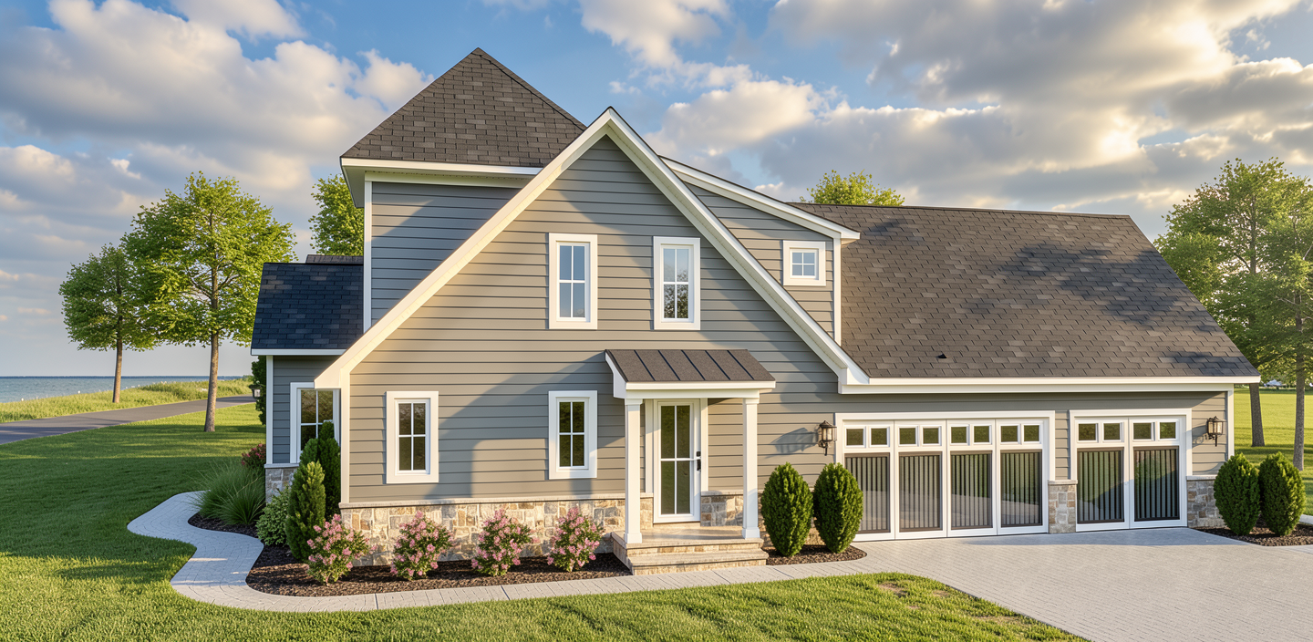 peux tu me faire un rendu r aliste avec cette image sans changer l angle de vue ni les mat riaux ni leur couleur je veux juste que tu rende le tout plus r aliste en ajoutant des arbres et du gazon je ne veux pas de paysagement autre que des arbres et du gazon je ne veux pas voir de lac reste fid le a 100 a ce qui est mod lis sur mon image donc n enl ve rien rend l enti ret de ce qui se trouve sur l image plus r aliste en suivant mes consignes assure toi que le graphisme du toit en bardeau d asphalte noir soit bien repr sent et clair fait le plus beau rendu que tu es capable avec mes consignes merci
