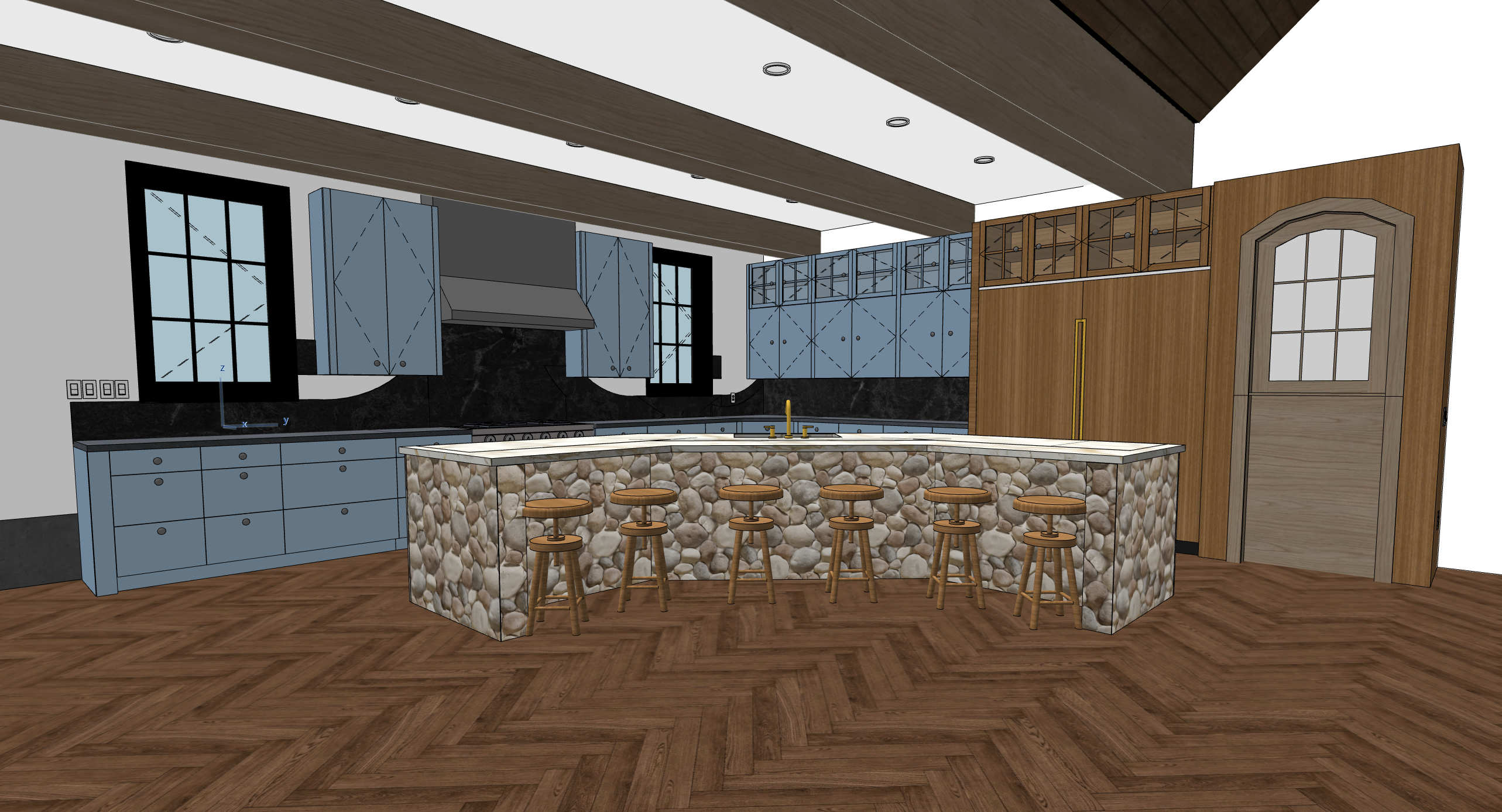 make this kitchen look as if it was in mountain home magazine add a vintage pendant light over the sink make the kitchen faucet and all the hardware look like raw brass make the door look like an antique french country door make the cabinets in the back a rich earthy dark grey blue make the walls a dark grey brown color