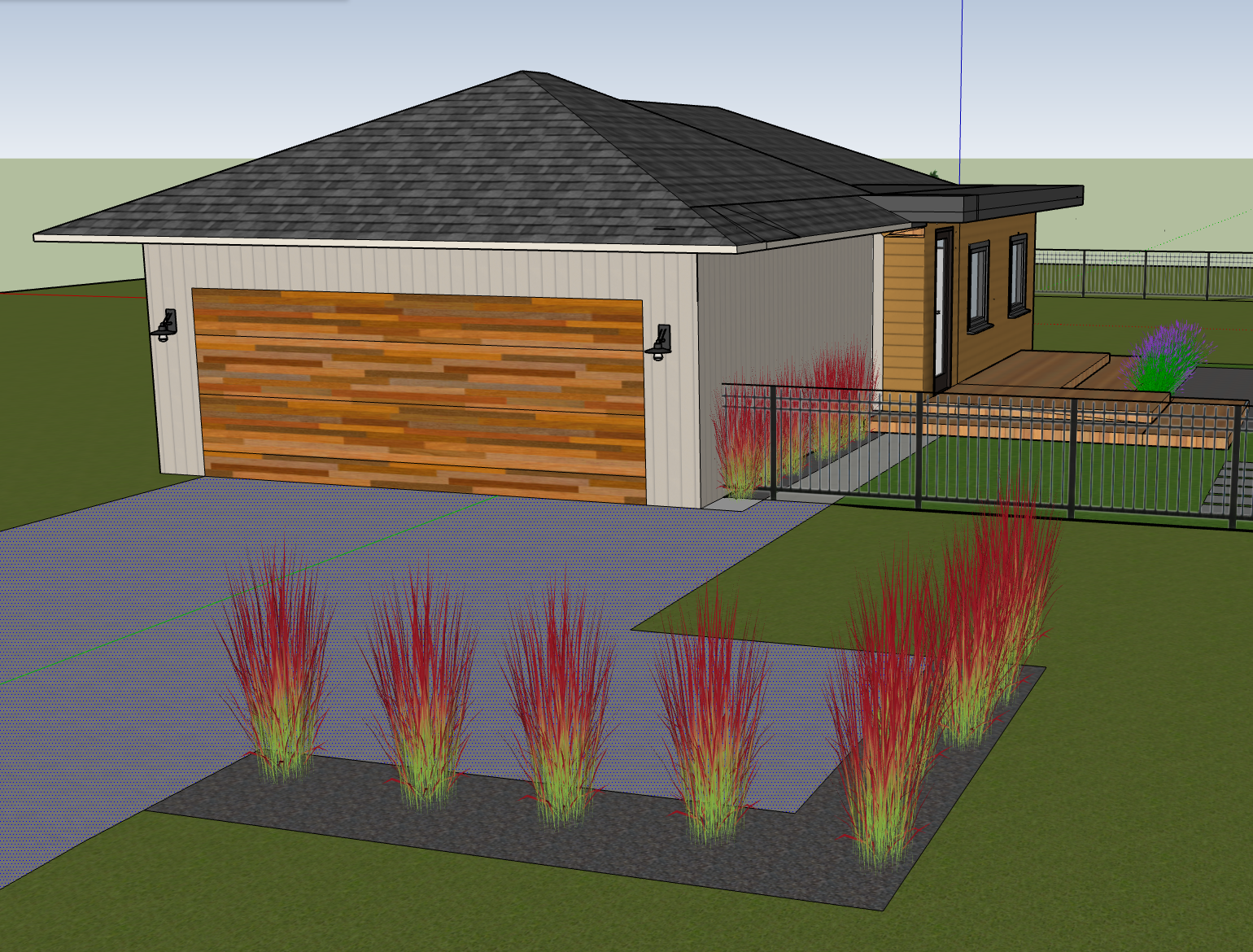 update the concept into a rendering but use the reference image to inform the siding for both the garage and rear addition section currently shown as brown horizontal cladding as olive green wood and warm tone soffits
