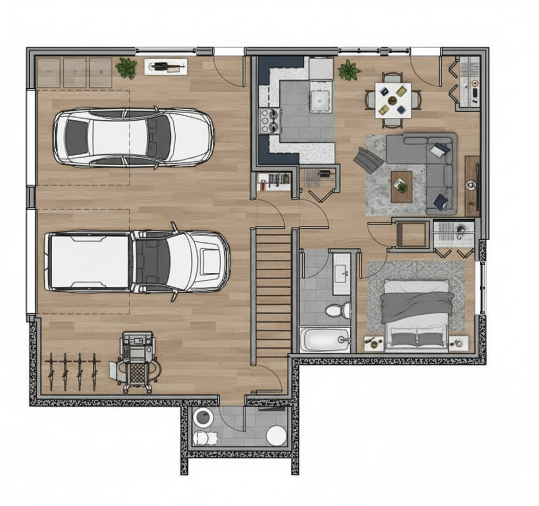 black framed windows contemporary style stucco with modern accents add some mature trees in the background add a walkway to the steps add a driveway to the garage door give the building a modern limestone look add some ornaments add more limestone detail to the building make it early afternoon with a nice sky only make the windows rail and light fixtures look black keep the building and the roof caps a light color also show the brick as noted in a modern darkish black grey tone to fit the theme make the window and door framed in black make the awning above the door black as well show the column in brick just like it is shown in my drawing make sure all he materials match the ones represented in the image i sent