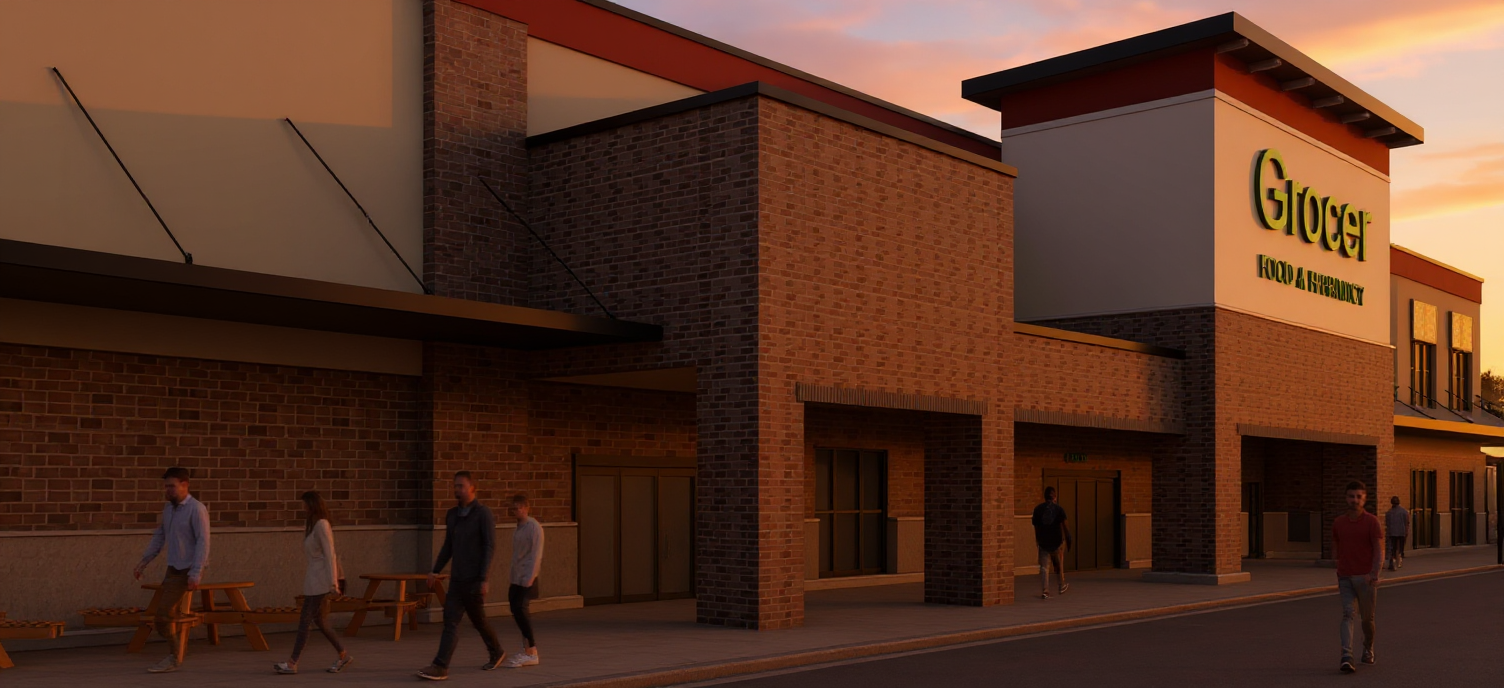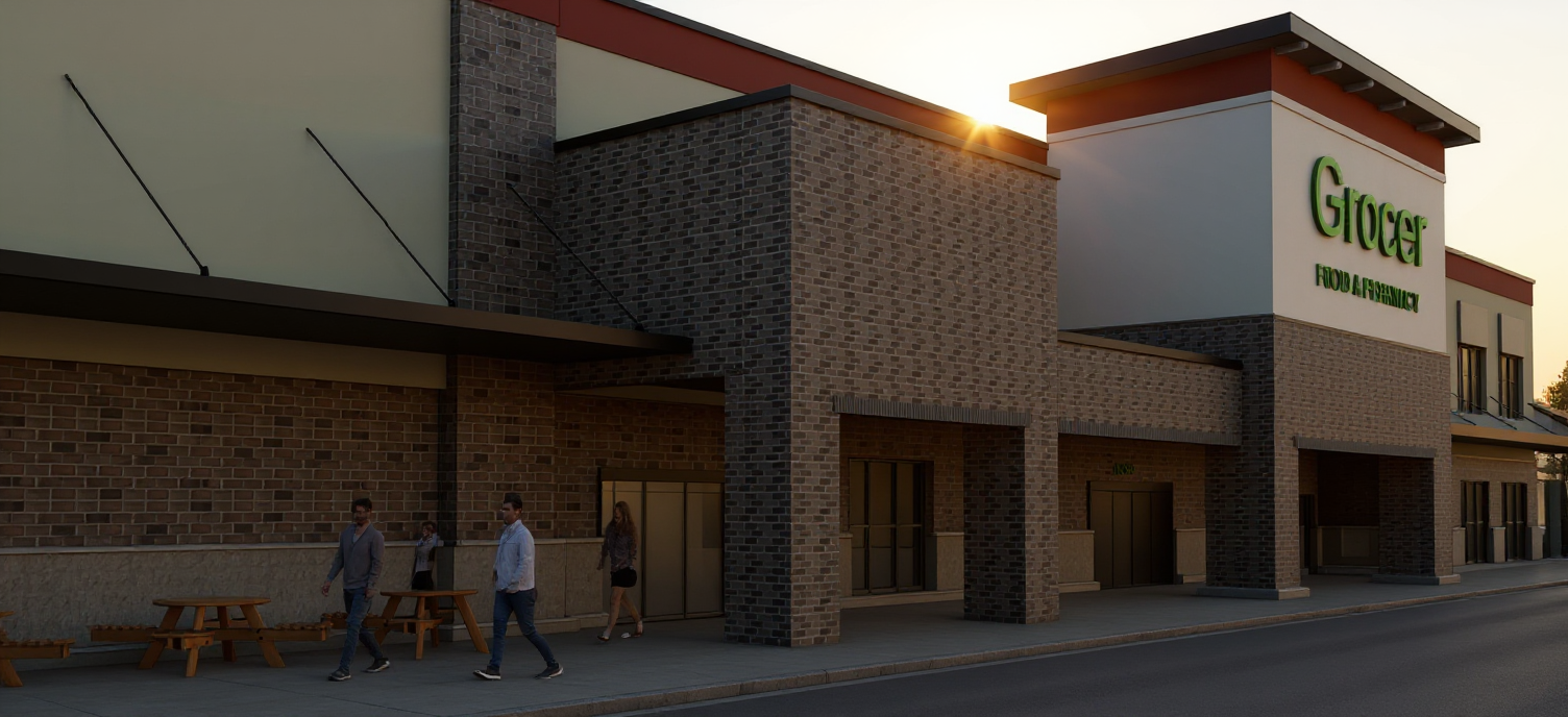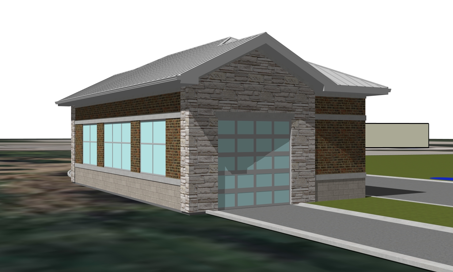 modern commercial building with large glass windows reflecting a clear blue sky brick facade with a warm reddish brown hue a split face light gray block base and stone accents in light gray the paved parking area is a sleek dark gray with subtle white lines galvalume standing seam metal roof and fascia surroundings include lush green grass creating a serene and inviting atmosphere bright and dynamic lighting with a soft shadow emphasizing the building s architecture daytime setting