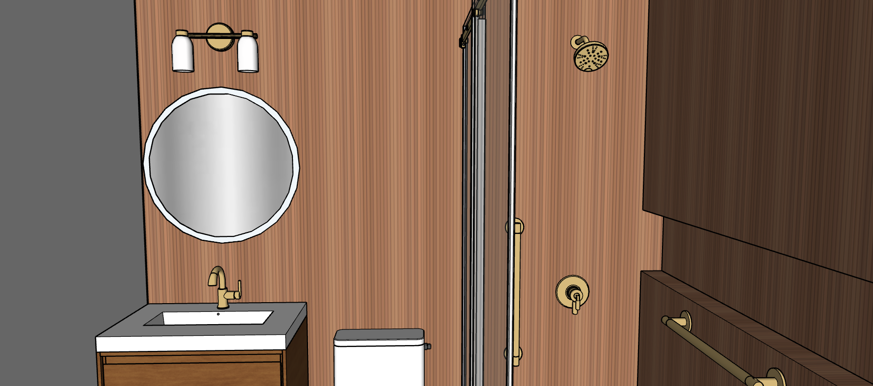 overall scene is evenly brightened using neutral 3500k lighting only do not add highlights glow reflections or new light sources lighting comes only from the vanity light with semi transparent scones 3500k and mirror backlighting the mirror has a soft white backlit halo 3500k evenly diffused there is no sunlight nor any light source other than the vanity light and backlit mirror the shower head and all shower fixtures are not light sources and emit no light mirror has a white semi transparent glass edge light fixture has white semi transparent glass scones honey maple wood slat tiles vary in tone and have slight depth in between grooves