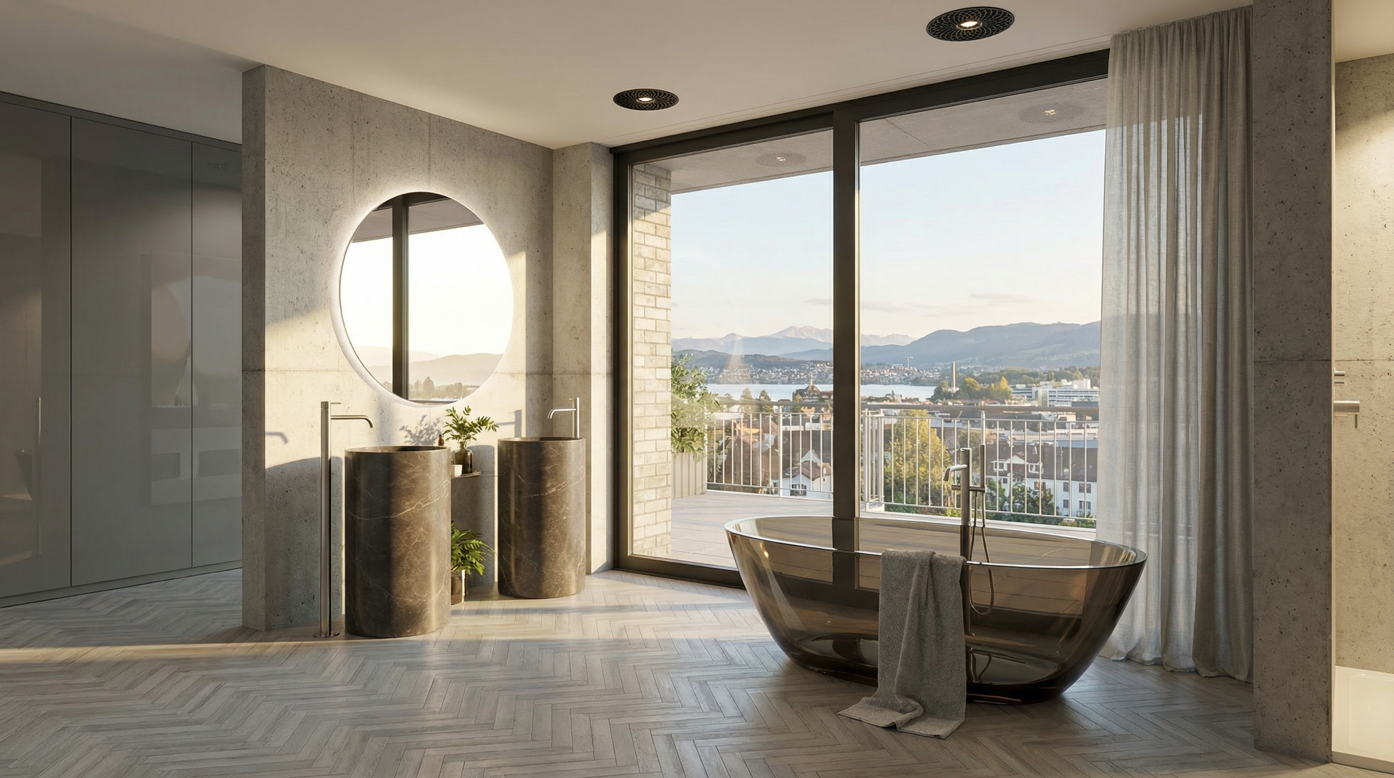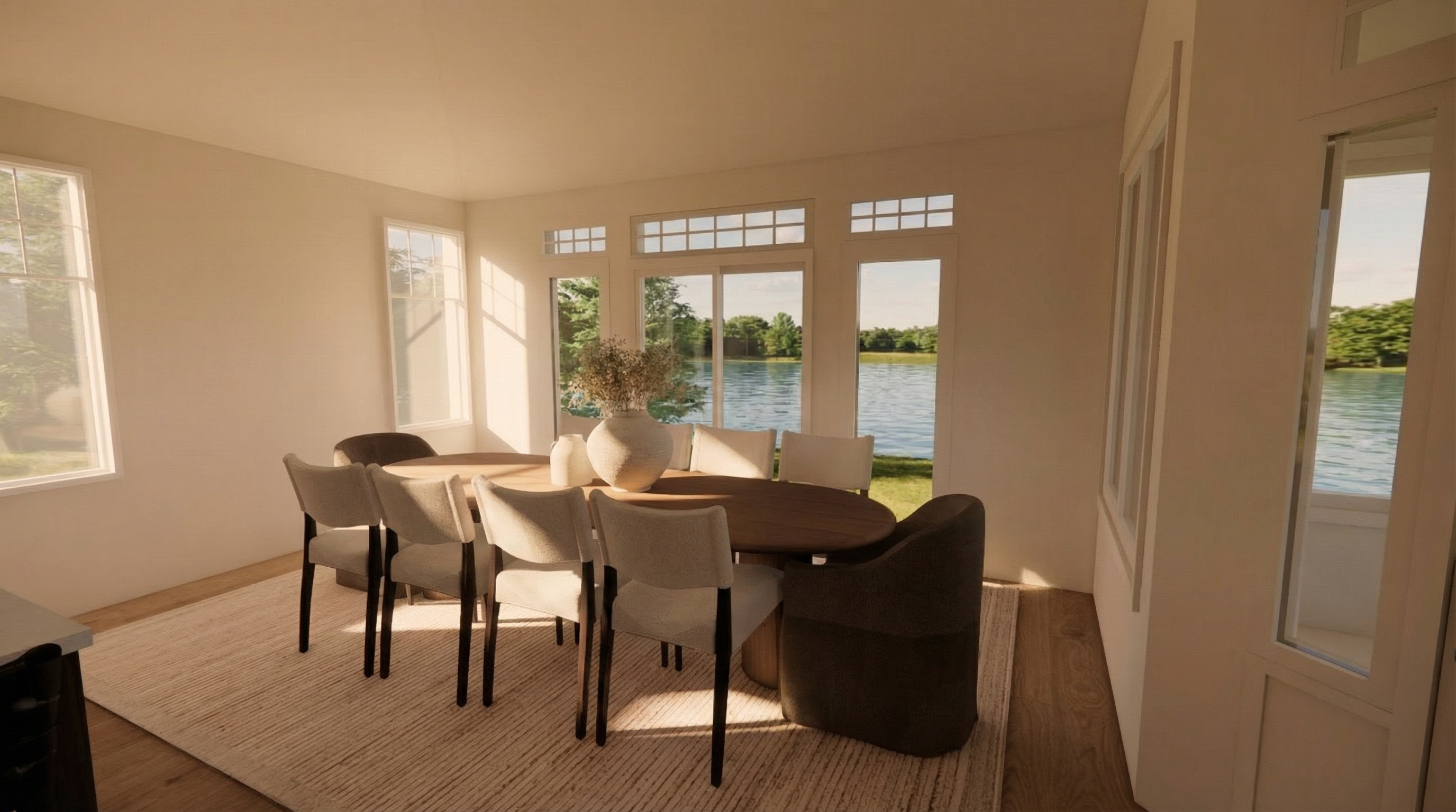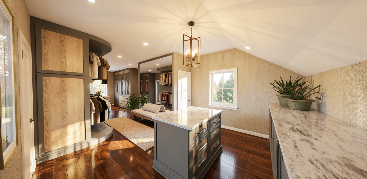 create a realistic rendering by adding dramatic lighting put four tall millwork panels on the far wall and paint that entire wall in the trim color