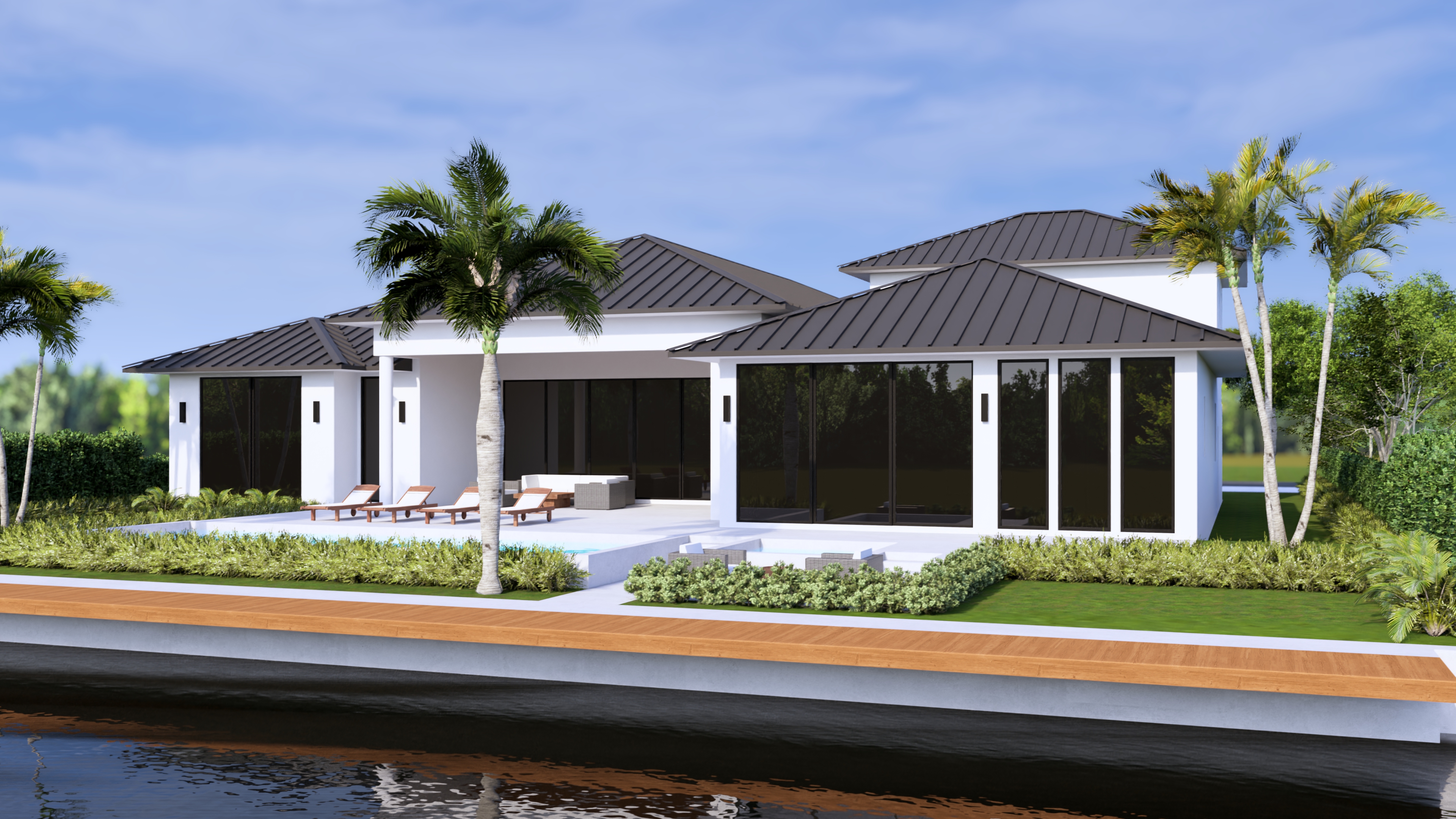 night shot with light from the pool reflecting on the house architecture