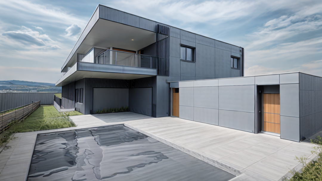 exterior shot kein zaun im hintergrund fassadenplatten dunkel bis schwarz alle fassadenplan gleiche farbe anthrazit