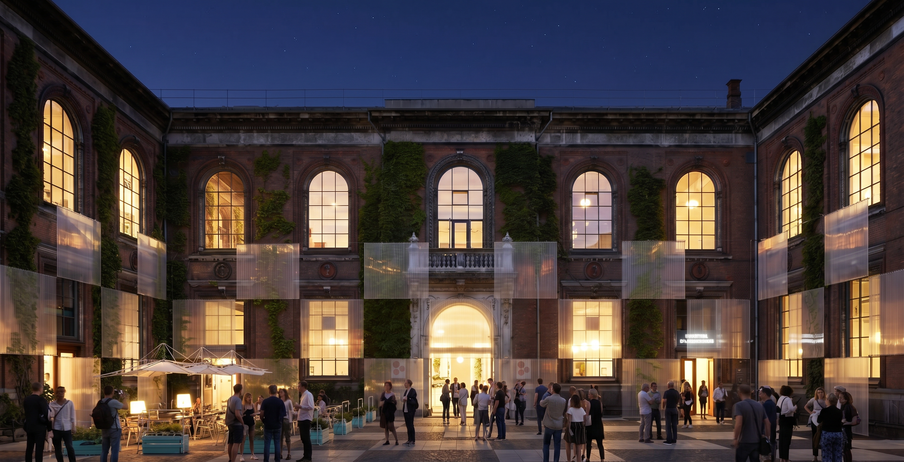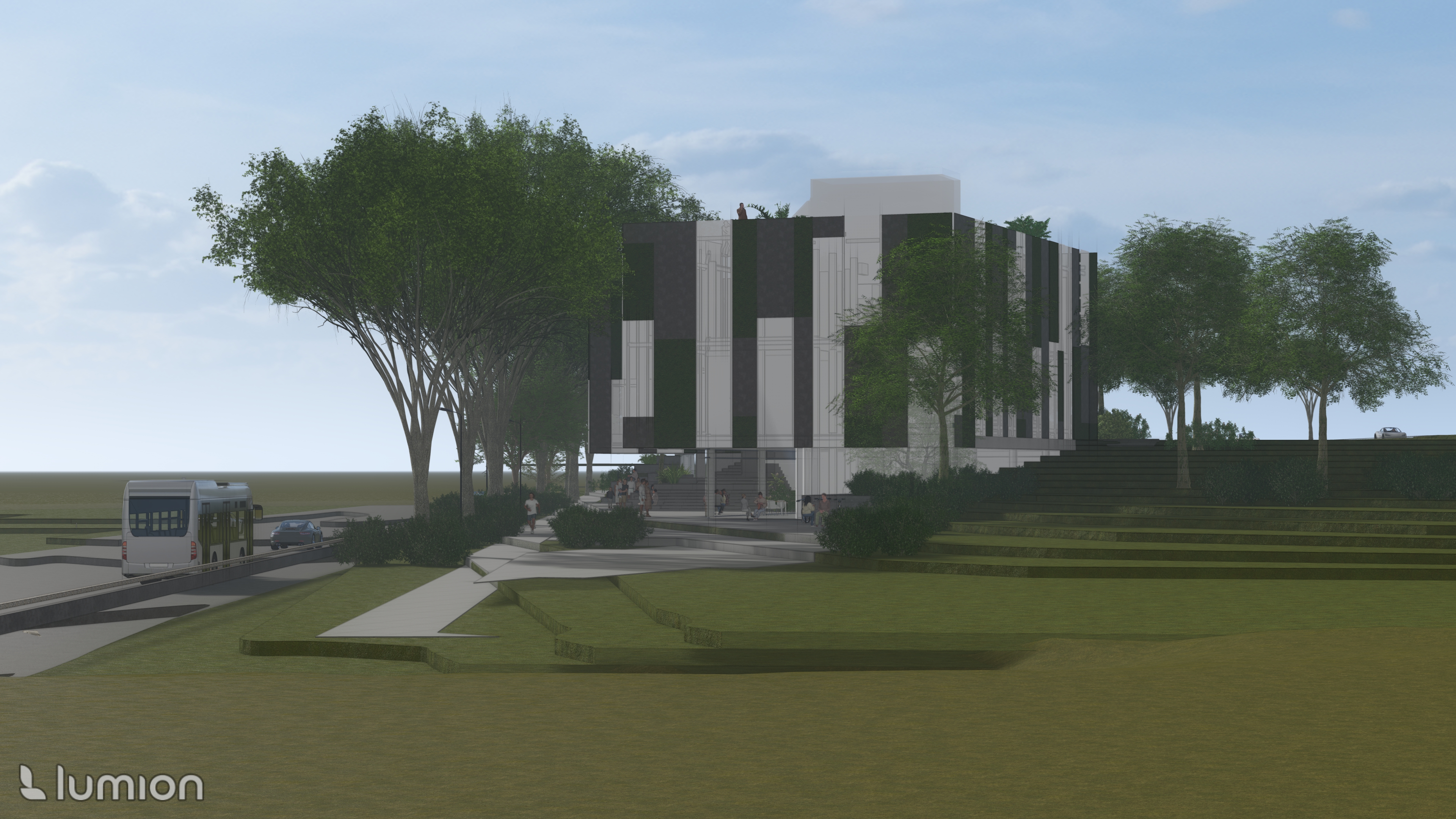 make this into a flat 2d elevation drawing more outlines on the building less of a render quality my professors like a ground line with the building coming straight up from it no perspective view the image is from straight on and the buildings are slightly crooked desaturate the sky make it more of a plain blue watercolor texture make the trees outline light gray vector lines maintain the cars and people but make them match the rest of the style and put the cars at the ground line make the roofline flat maintain the colors on the building but lower the opacity the building the rooftops are flat make the ground a thin line with no color underneath make the grass on the sides a lighter watercolor texture lighten the sky to a very light watercolor texture make clear vector line s keep the background landscape context but make it all light vector lines mute the brown panels a little bit dont make the people too dark make the cars in line with the ground line