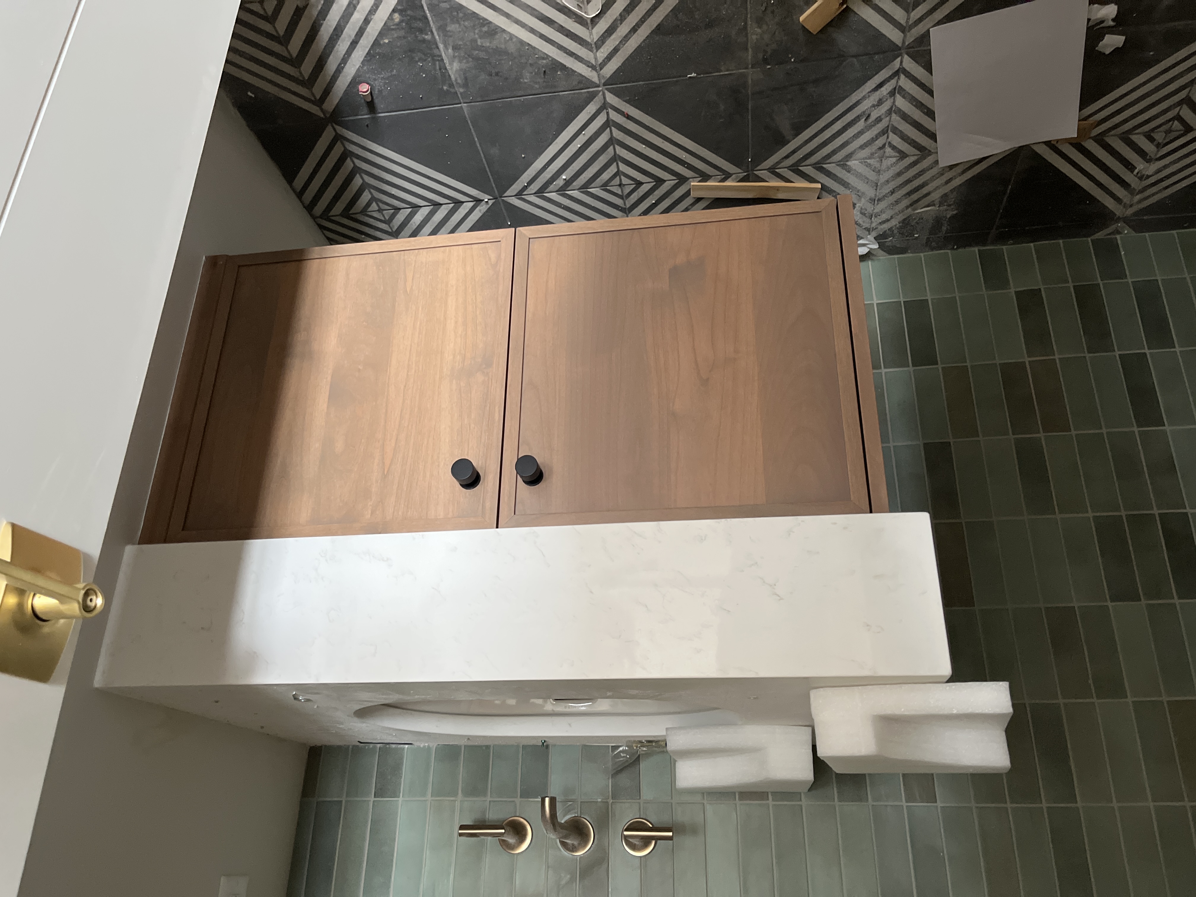 preserve the exact cabinet layout dimensions proportions door styles hardware placement and all architectural features do not change the design geometry colors materials or lighting direction only enhance clarity edges smoothness shadows and subtle realism while keeping the original look completely unchanged clean up the dust and items on the floor remove everything on the countertop and restage for a bathroom