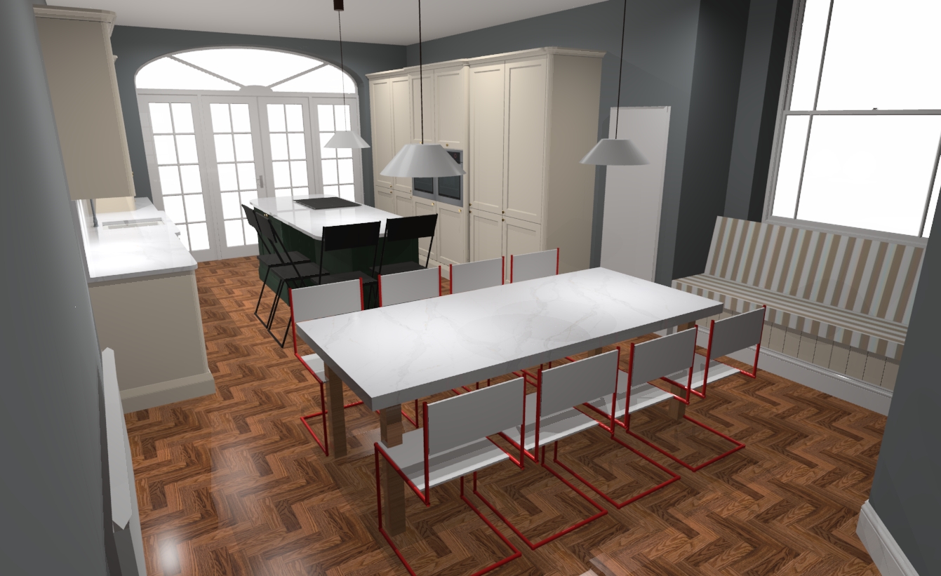 change chairs to beige curved back stools add items on worktops keep induction hob and undermount sink add pendant lights over island unit change red chairs to match colour and style of stools