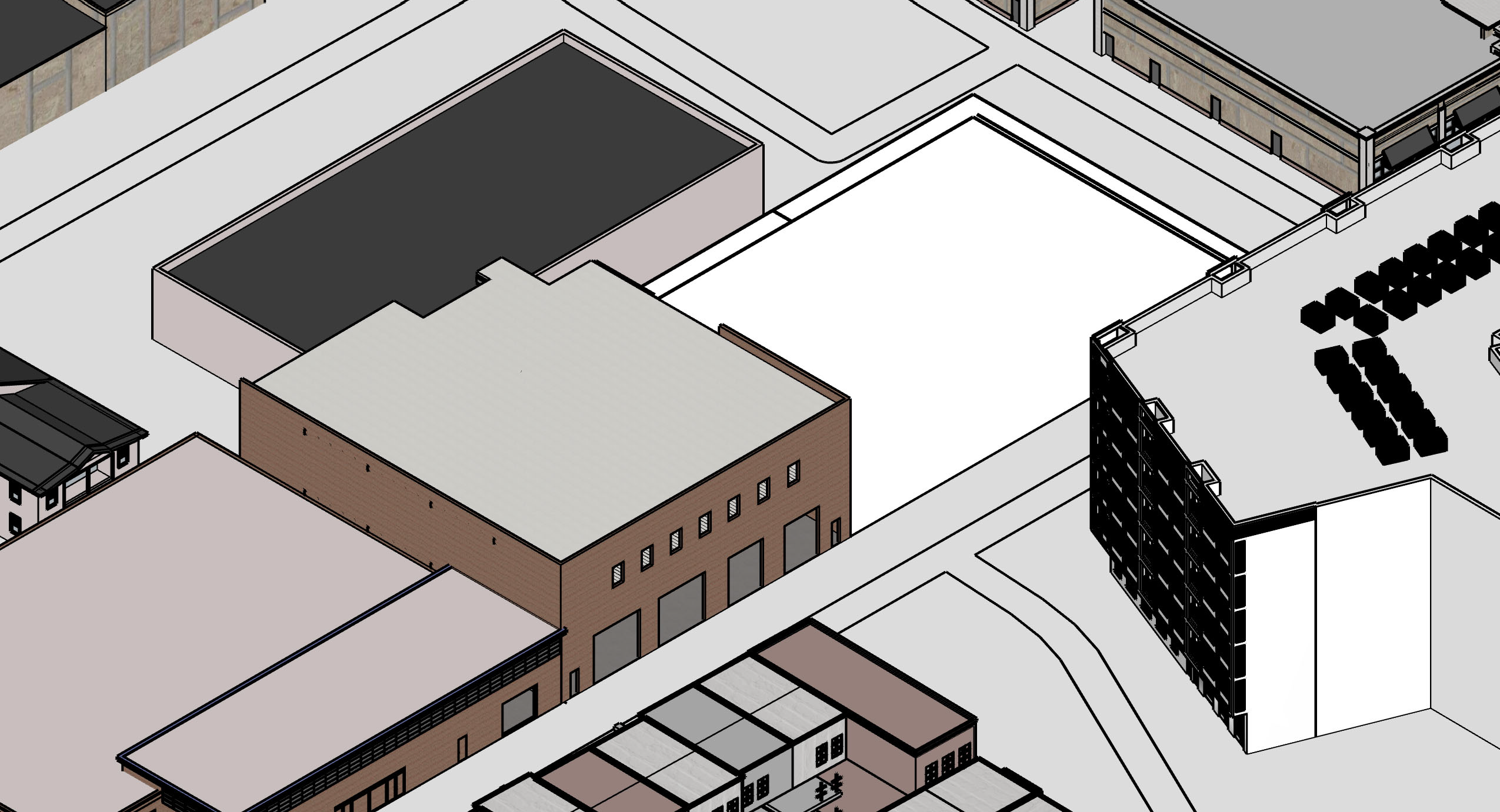 maintain the original camera view and all existing building geometry do not change proportions scale or materials turn this scene into an active construction site add a tower crane or hydraulic construction crane positioned on or near the site lifting structural materials pallets of supplies lumber stacks rebar bundles insulation clt panels metal decking wrapped materials construction equipment such as a forklift scissor lift or small excavator temporary fencing jersey barriers cones site signage and steel scaffolding along building edges workers wearing ppe vests helmets but small and subtle in scale so they don t overpower the frame loose debris piles gravel patches plywood barricades and staging zones visual style match the soft atmospheric watercolor like realism of the reference image muted tones soft cloudy sky light grain subtle edges warm daylight but not overly saturated do not alter the building forms windows rooflines sidewalks or camera angle replace architecture only add construction activity and foreground elements final appearance should look like a building mid assembly with visible work zones equipment and industry atmosphere