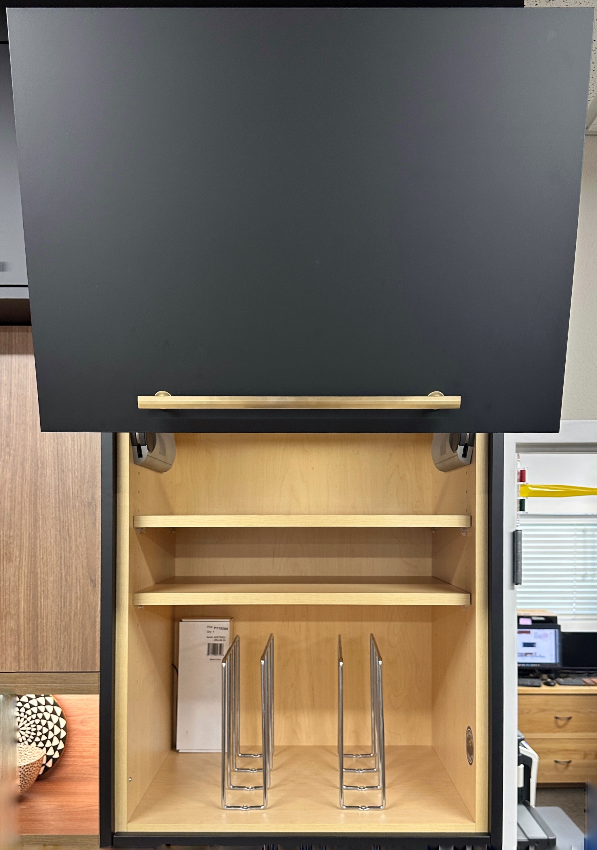 change to natural kitchen lighting change the background on the right to a blurred out dining room put cookie sheets between the chrome dividers and stage the shelves with muffin tins do not change anything else about the cabinet