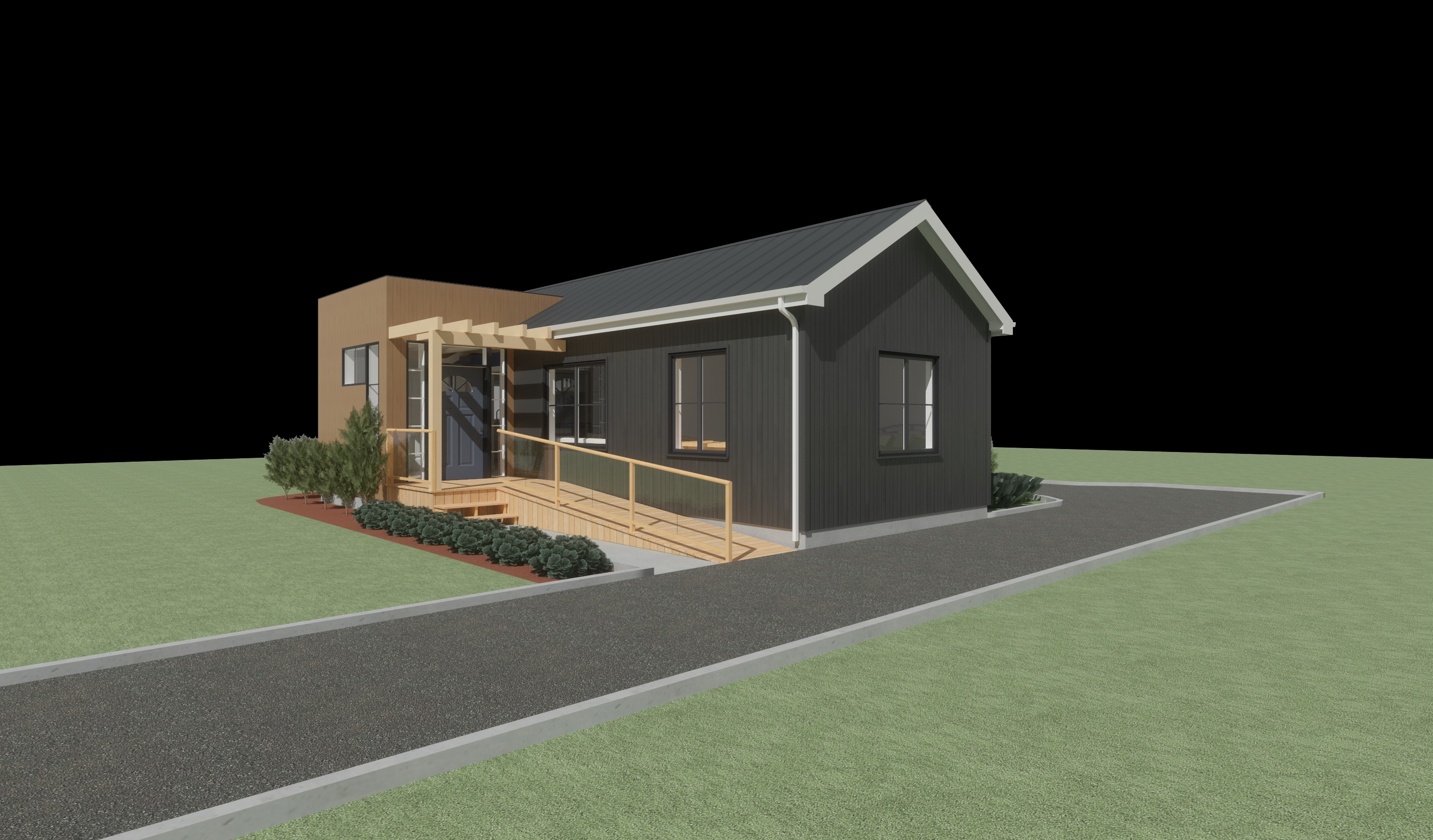 add a forest background and maintain all finishes and massing of the image provided railing should be glass panel facia and down spouts to be black