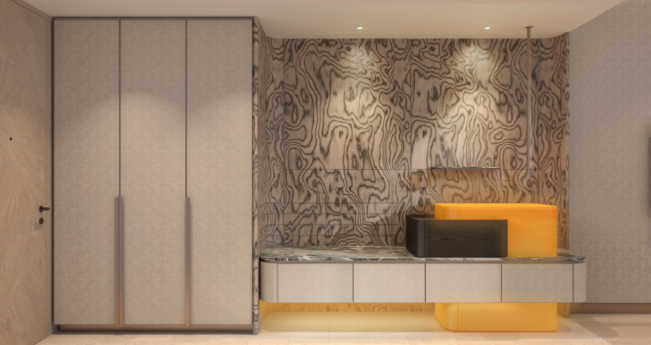 add two drinking glasses on the shelf ensure the glasses are proportionate realistic and neatly placed do not alter the shelf design materials or layout do not change the overall design camera angle or material proposal maintain all original materials and finishes exactly as provided enhance realism through accurate lighting reflections and material rendering only produce a clean professional photorealistic architectural render