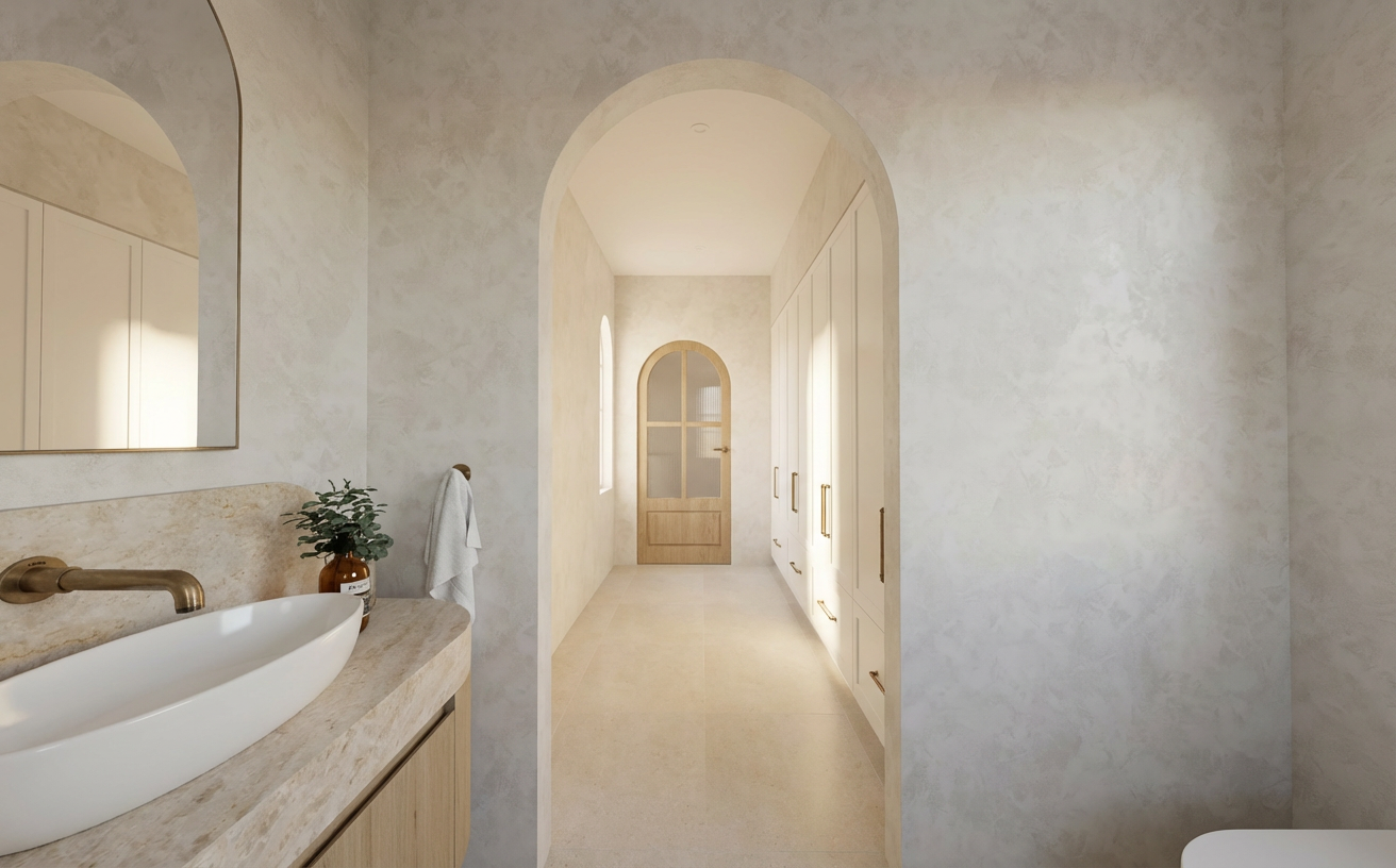 the roof will be made of arabic tiles the house will be the color shown in the photo the window and door frames will be white lacquered aluminum the stonework will be rubble basalt from arucas the exterior paving will be ceramic stoneware and stamped concrete the grove on the right will consist of yucca and dragon trees and the one in the background a flamboyant tree along with some flowers the balustrade will be white it is nighttime and through the windows some people can be seen while others are outside where a red mercedes 200d is parked